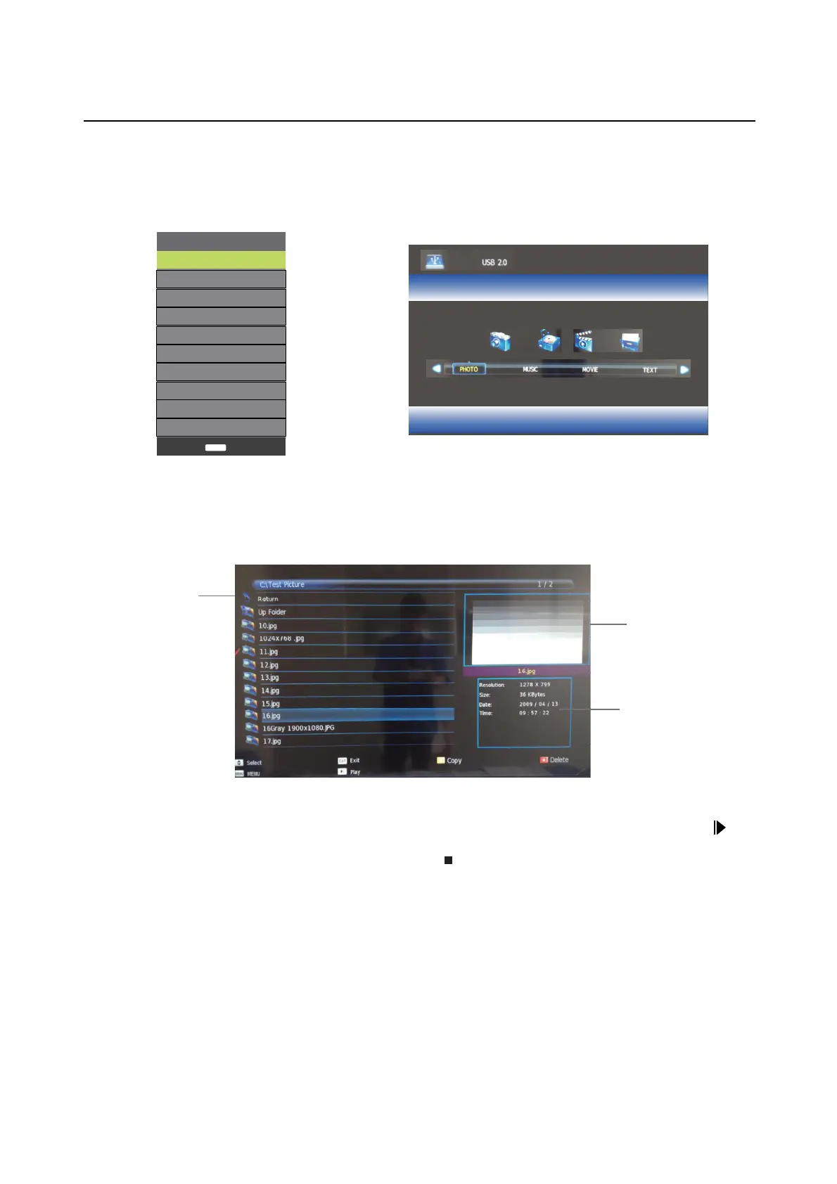 2.Press left/right buttons to select the files on the USB device(PHOTO,MUSIC,MOVIE,TEXT)to view or play.