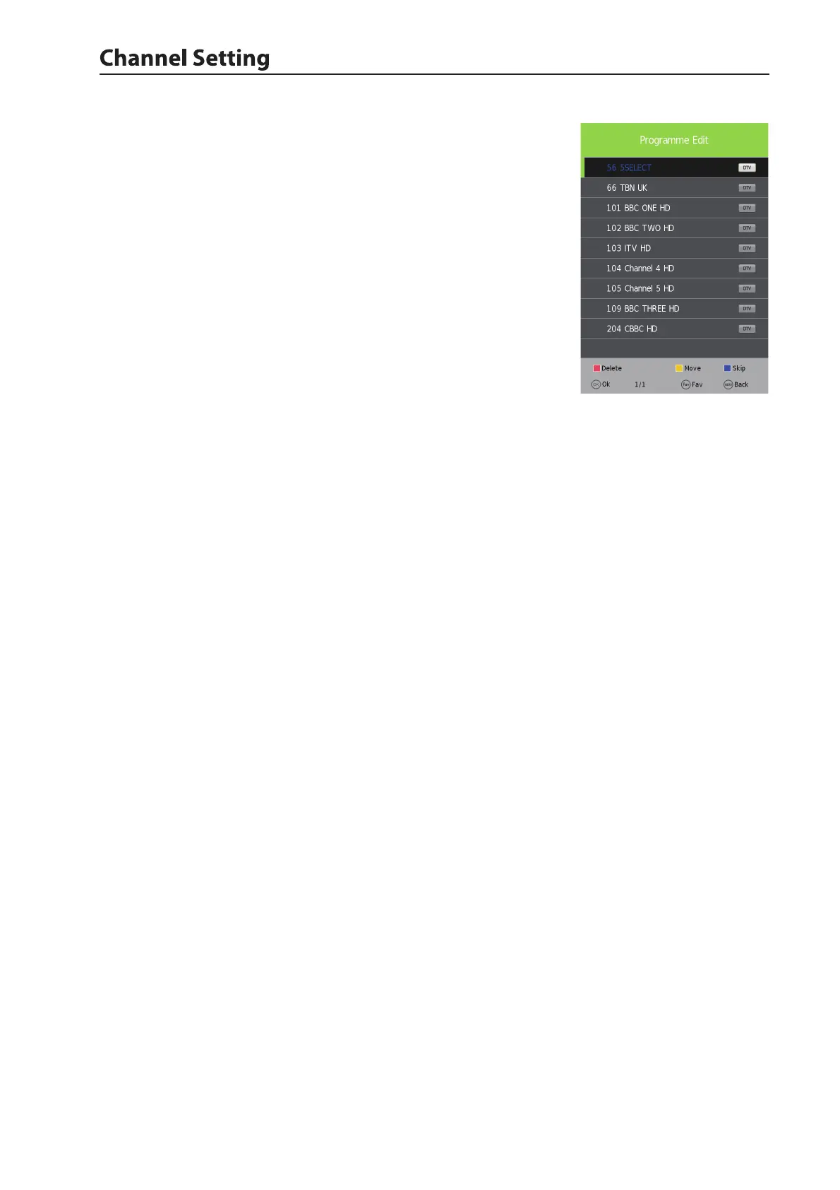 Press the red key on the remote control to delete a channel.