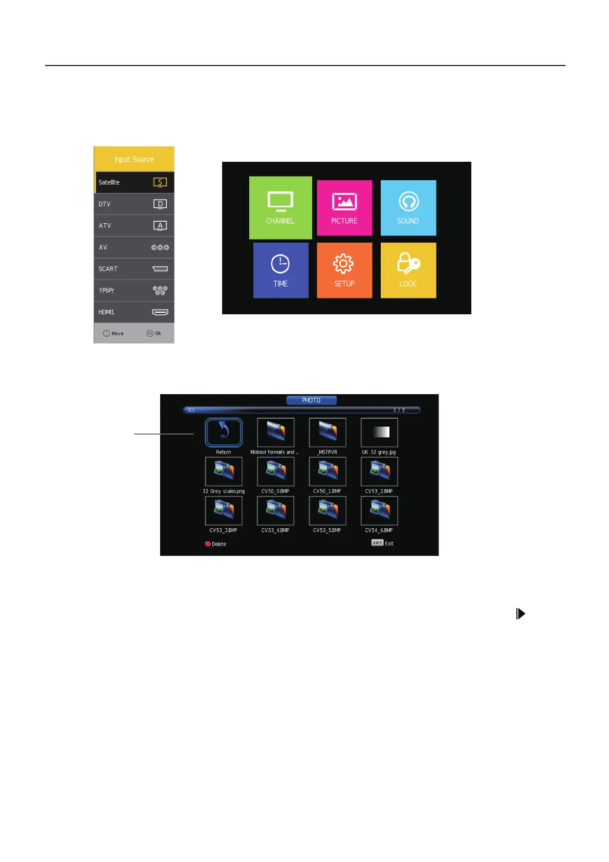 2.Press left/right buttons to select the files on the USB device(PHOTO,MUSIC,MOVIE,TEXT)to view or play.