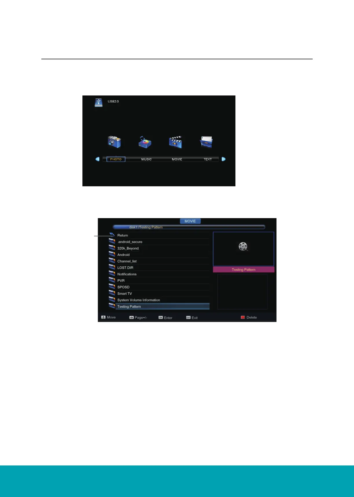 2. Press left/right buttons to select the files on the USB device(PHOTO,MUSIC,MOVIE, TEXT)to view or