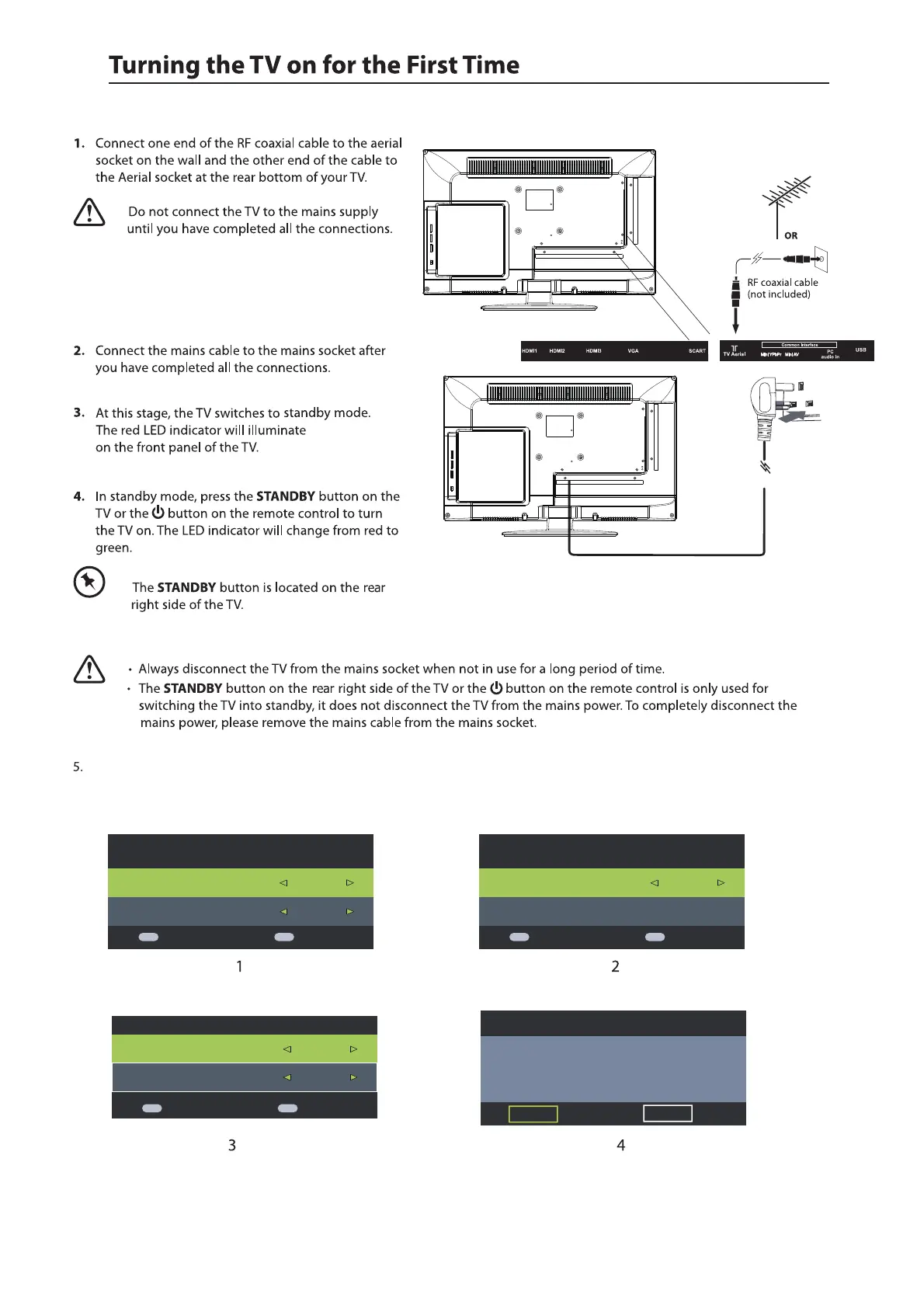 5. If this is the first time you are turning on the TV and there are no programs in the TV memory, the Quick Start menu
