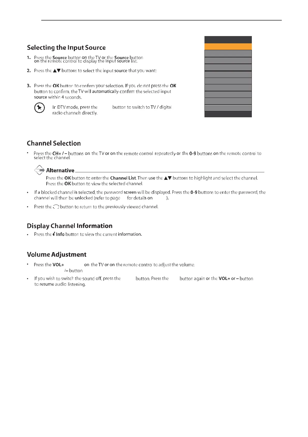 DTV, ATV, AV, SCART, YPBPR, HDMI1, HDMI2, HDMI3, PC, Media.