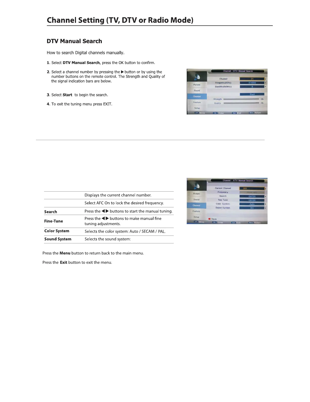 1. Press the ▲▼ buttons to ATV Manual Search then press the OK button to confirm.