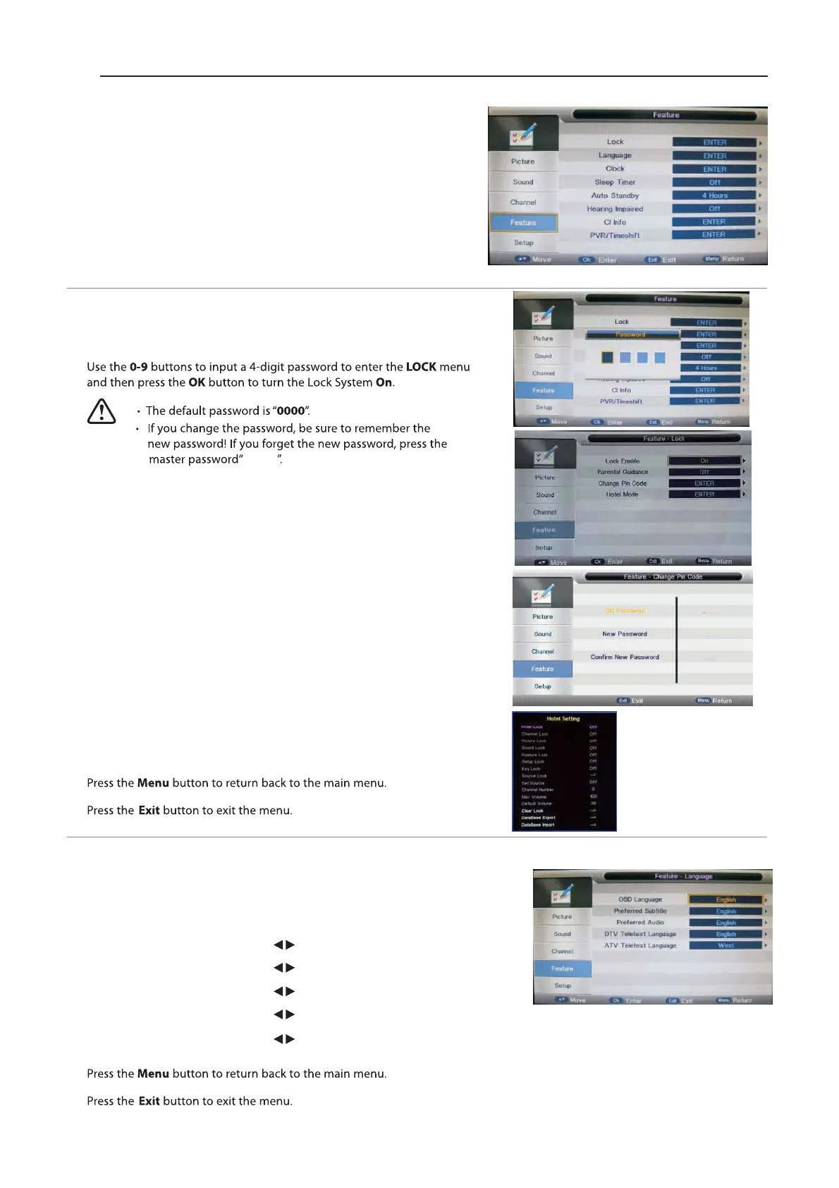 For Auto, Manual tune and TV reset a password will also