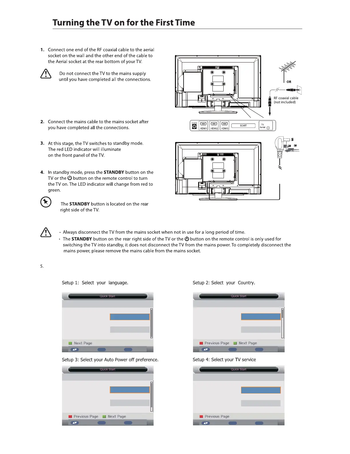5. If this is the first time you are turning on the TV and there are no programs in the TV memory, the Quick Startmenu