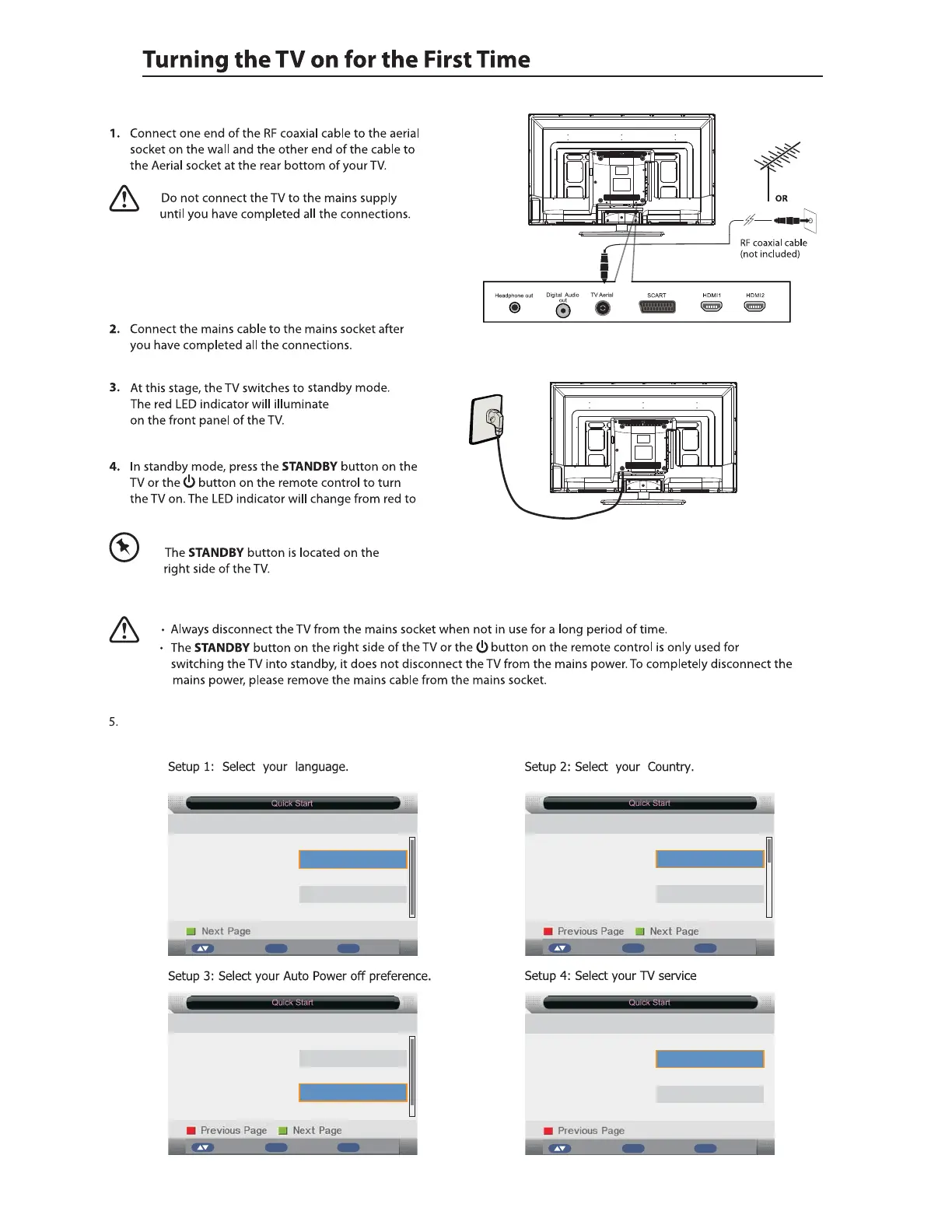 5. If this is the first time you are turning on the TV and there are no programs in the TV memory, the Quick Start menu
