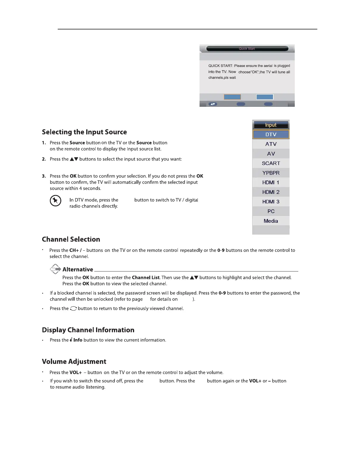 DTV, ATV, AV, SCART, YPBPR, HDMI1, HDMI2, HDMI3, PC, Media.