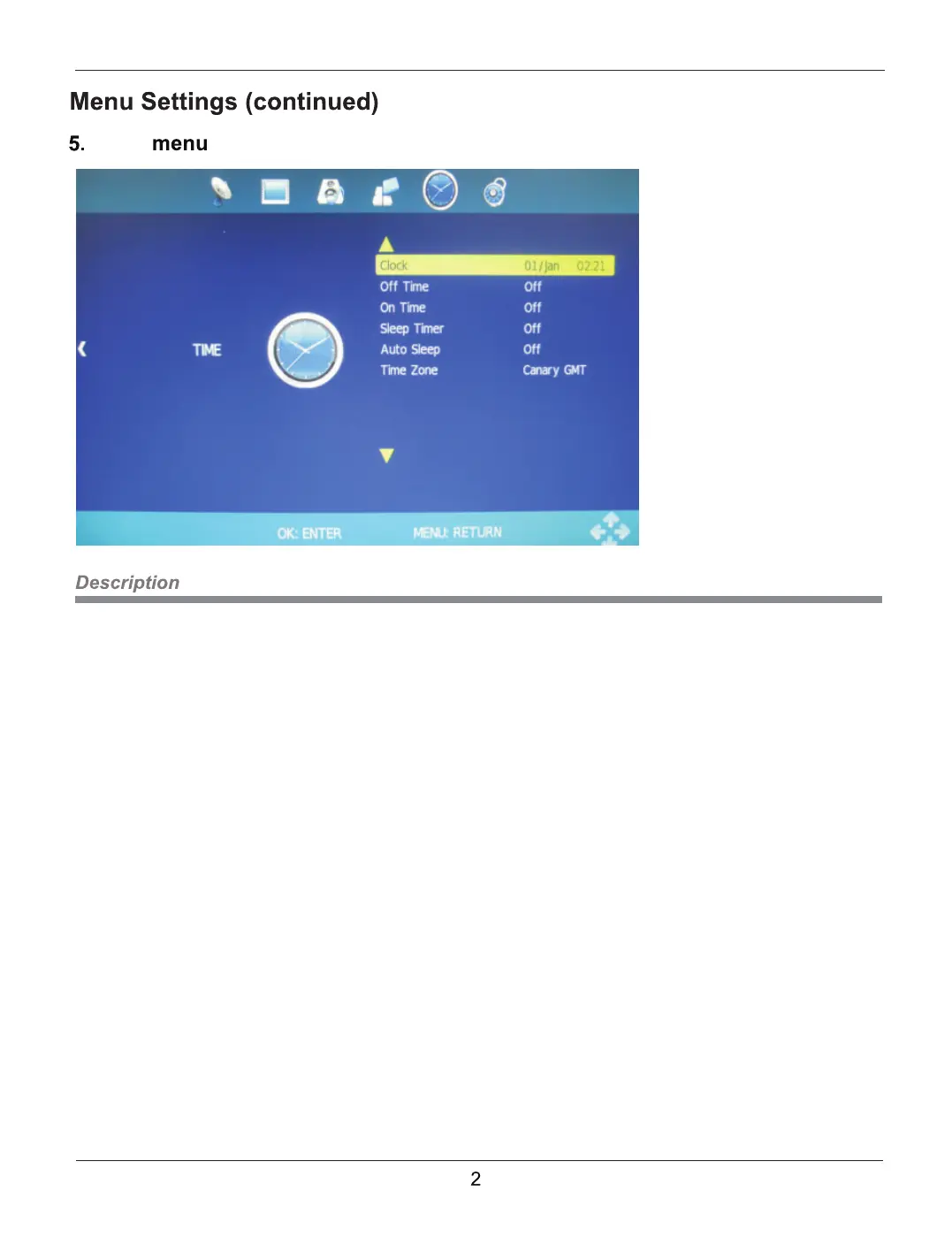 After selecting Time Zone, press ''OK'' key to enter into Time Zone submenu. Press