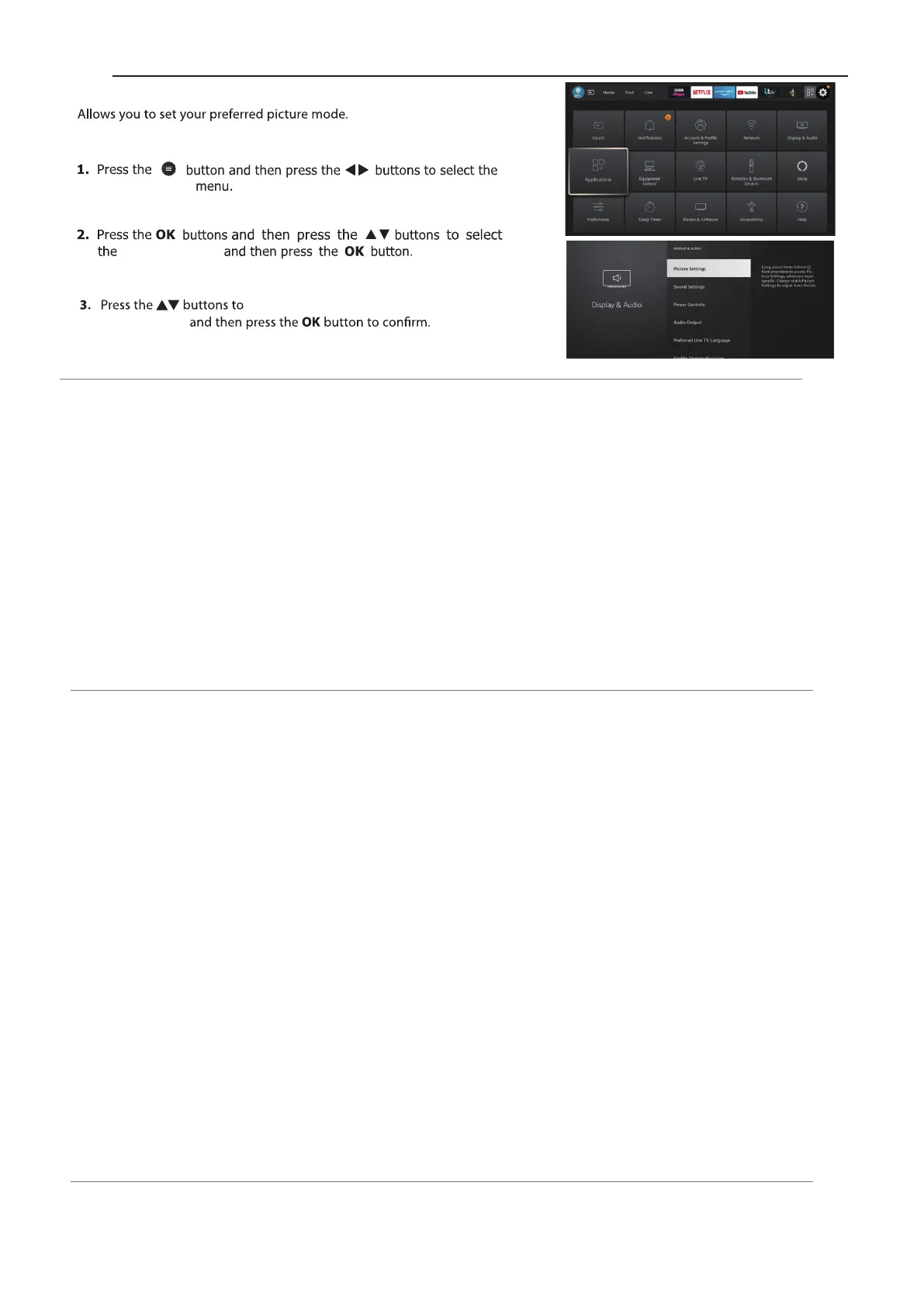 Set the picture modes: STANDARD / VIVID / SPORT / FILM / GAME (HDMI).