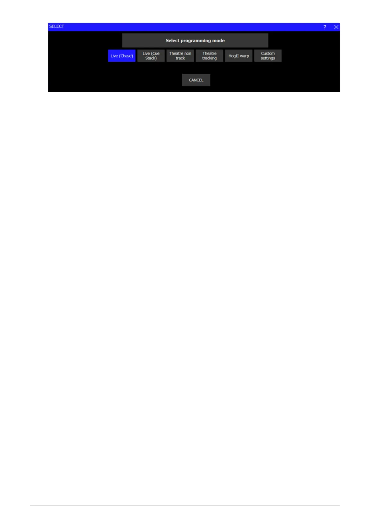 • Live (Cue Stack)- Faders activate Cue Stacks. When recording only data in the programmer