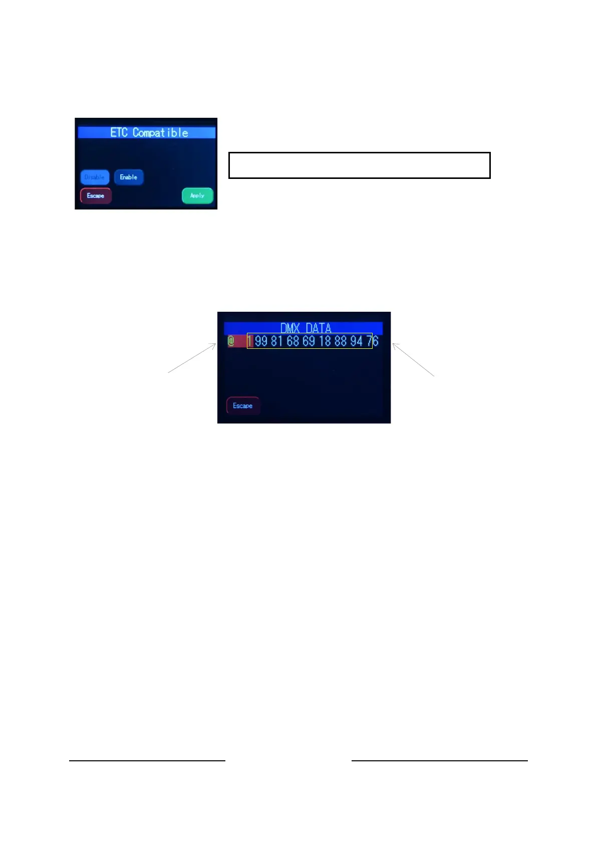 This option allows user to see the DMX channel intensities being received by the fixture. This display