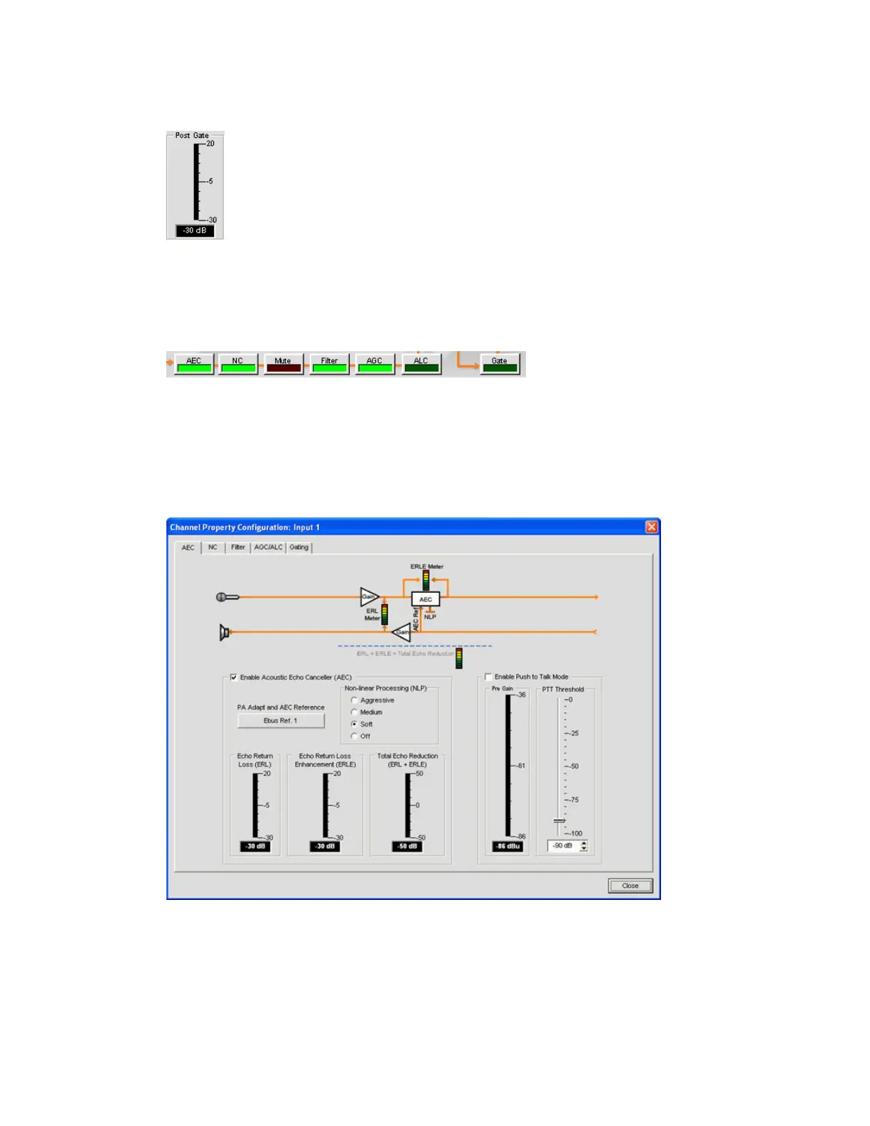 The Post Gate Meter displays the audio level after gating. Channel gating for mic inputs is configured on the