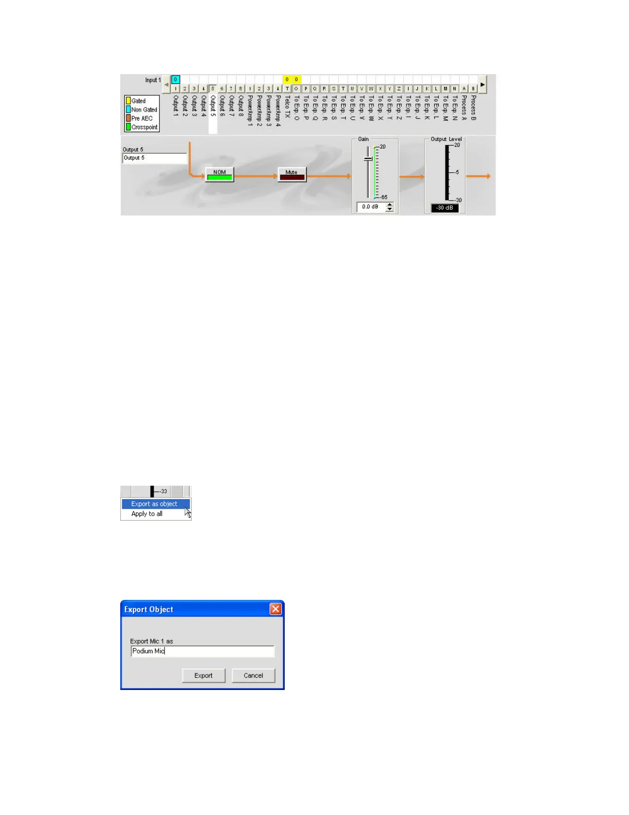 on or off; toggle Mute on or off; and use the Gain slider to set the gain level for the channel. The Output Level