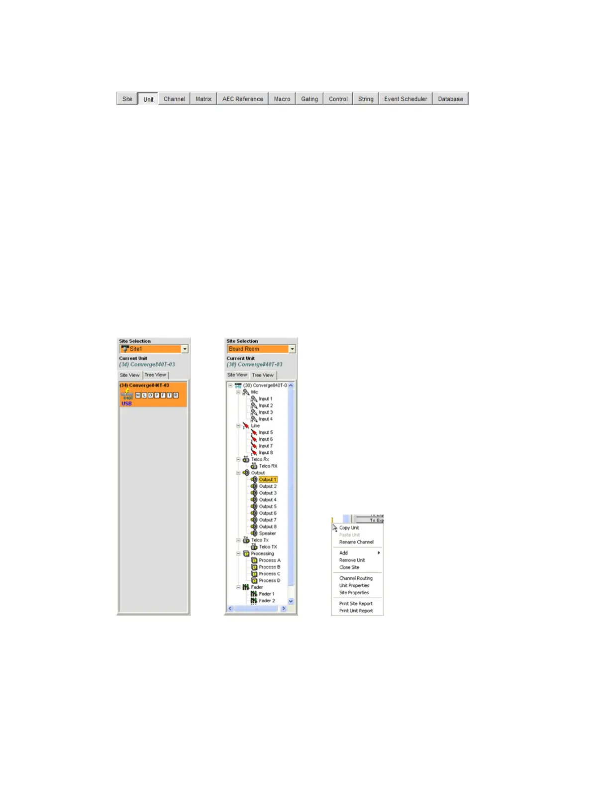 Right-clicking in either the Site View tab or the Tree View tab brings up a context menu with site, unit, channel, and