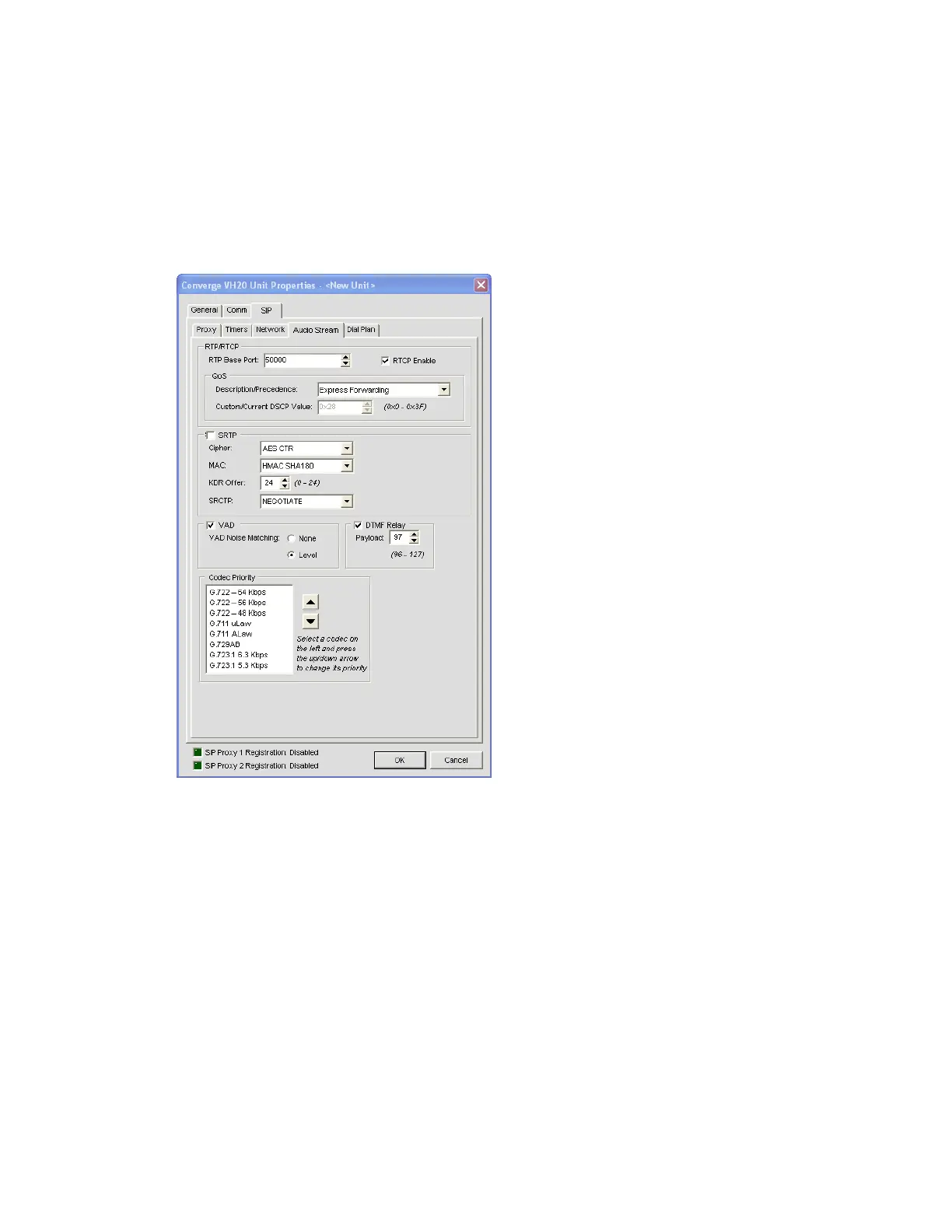 The Audio Stream tab contains user configurable settings for the audio stream, encryption, QOS and Codec