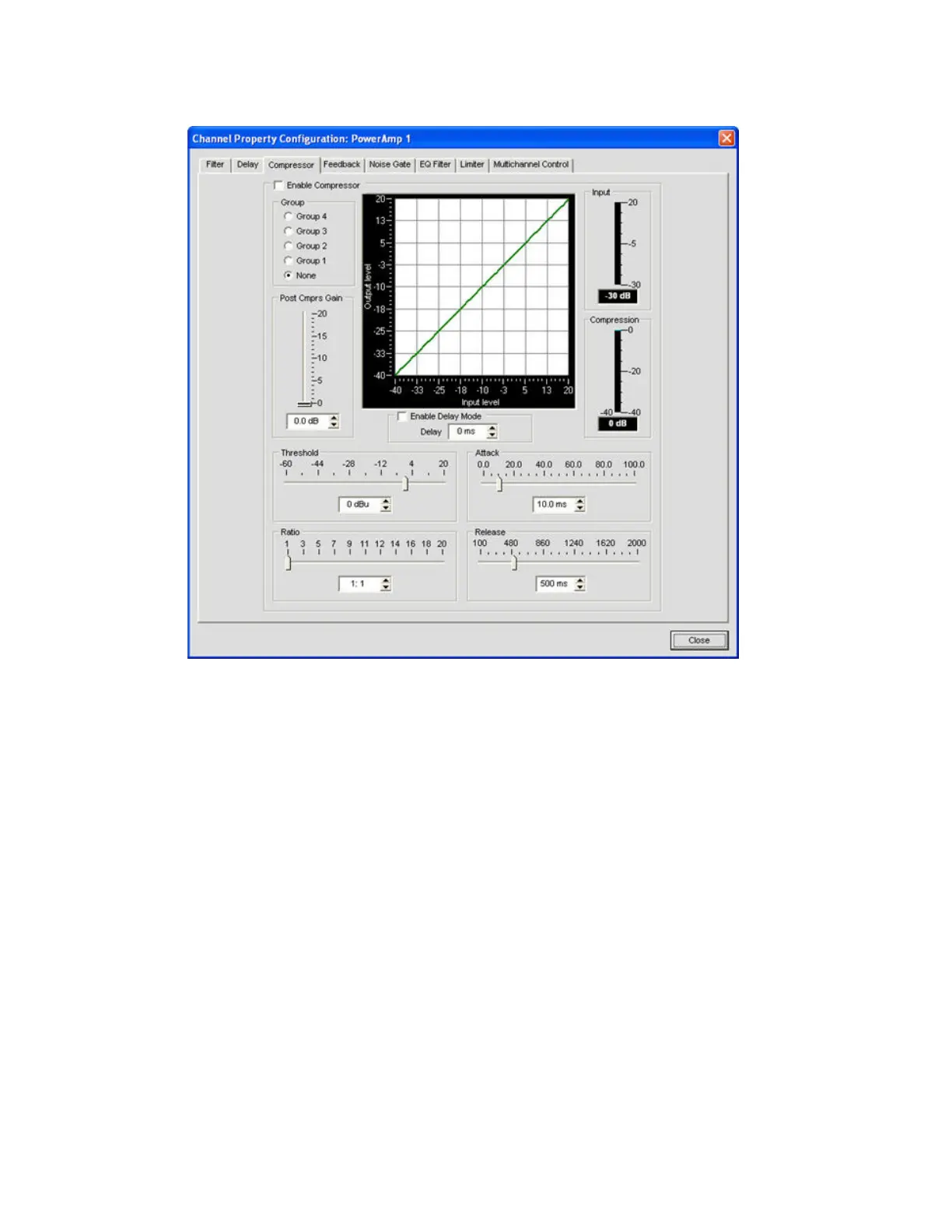 • Compressor: Allows the user to enable compression on an amp channel based on configurable parameters.