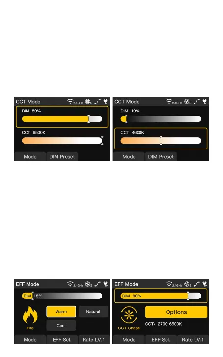 Lighting Mode:Short press to switch between each page (CCT-EFF-