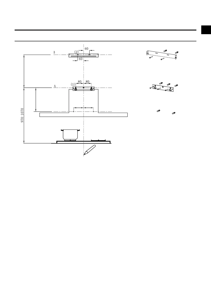 Eine horizontale Linie A in einer Höhe von 970 bis 1070 mm über der Herdplatte.
