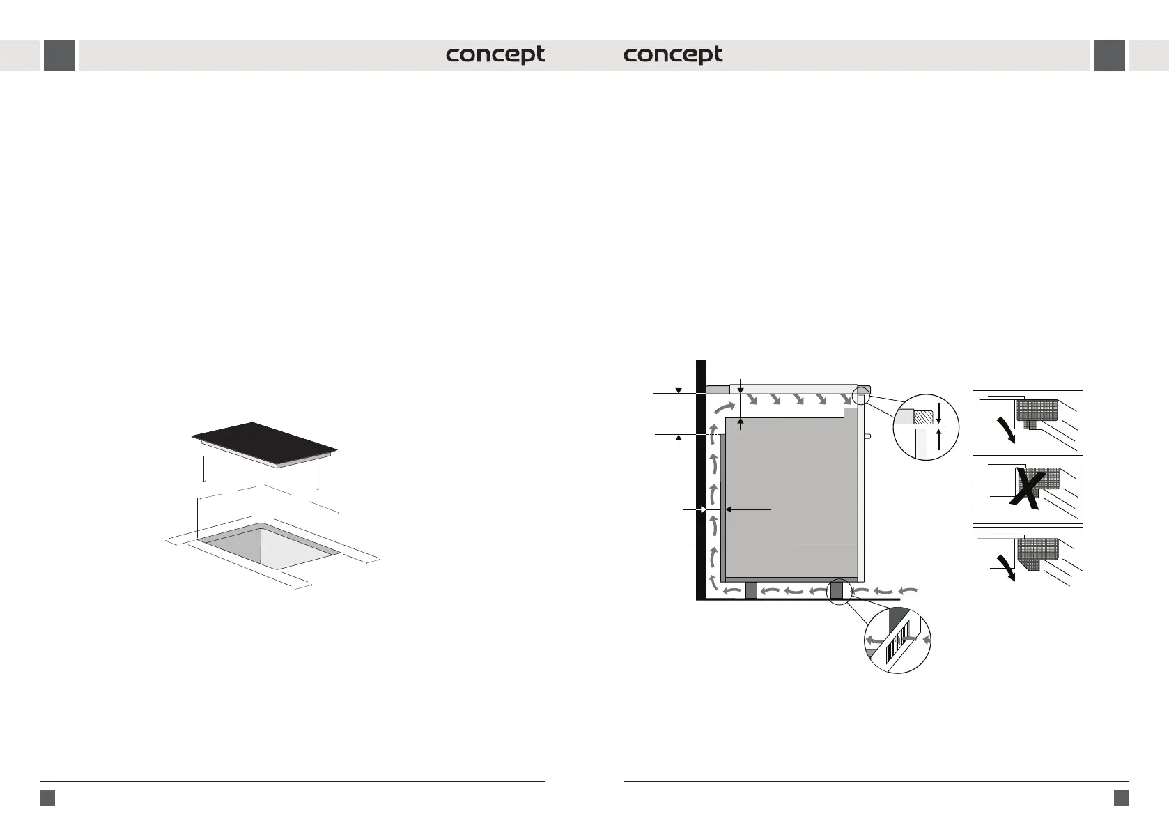 zalecamy umieszczenie kratki wentylacyjnej w dolnym cokole. Pod płytą grzejną musi być odstęp co najmniej 50