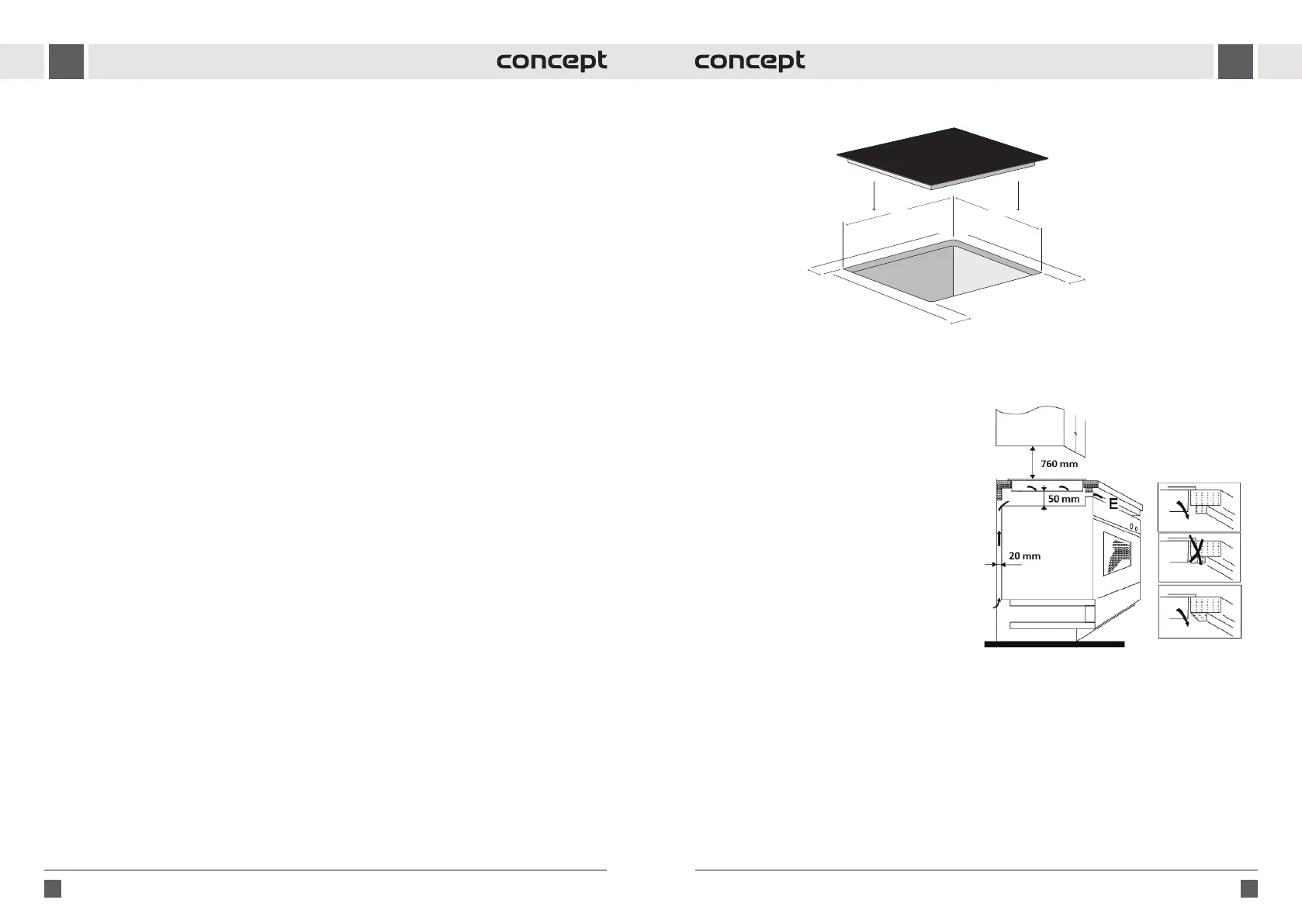 Pod płytą grzejną musi być odstęp co najmniej 50 mm, a za tylną ścianą szafki musi być odstęp co najmniej 20 mm