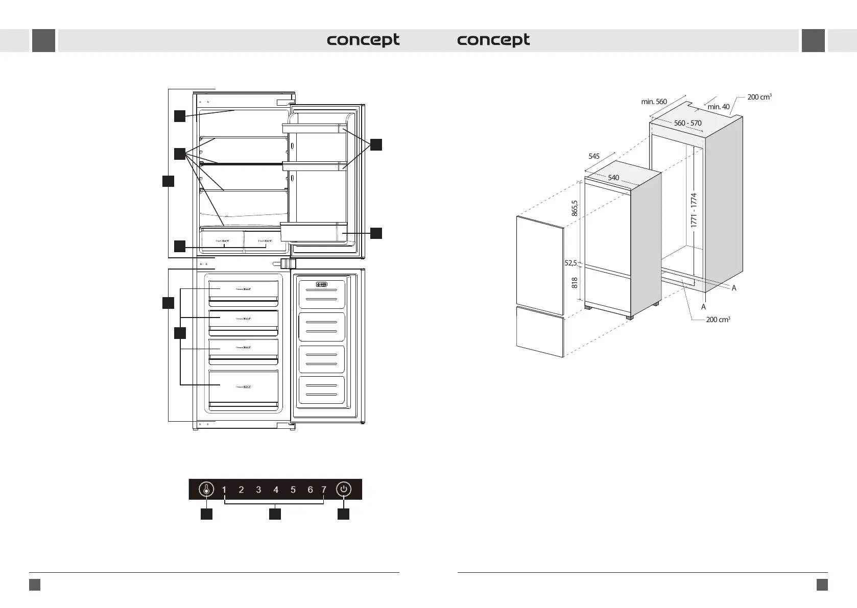 augšpusē jābūt brīvai vietai gaisa izplūdei, kā arī grīdā zem ledusskapja jābūt izgriezumam (ar ventilācijas režģi).