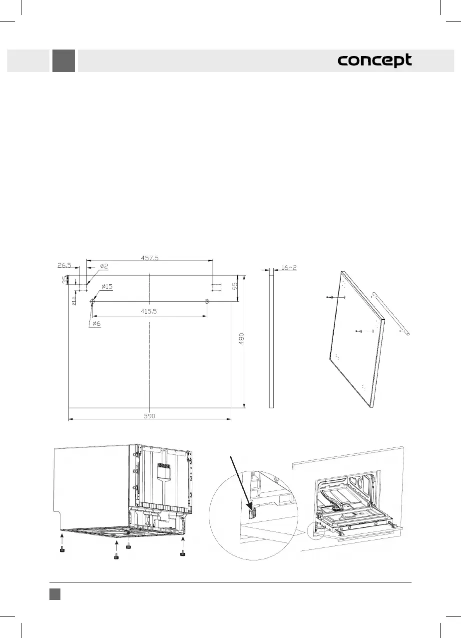 • Po připevnění krycí desky k držákům a zavření dveří myčky, by měla být krycí deska souběžná s okolními skříňkami