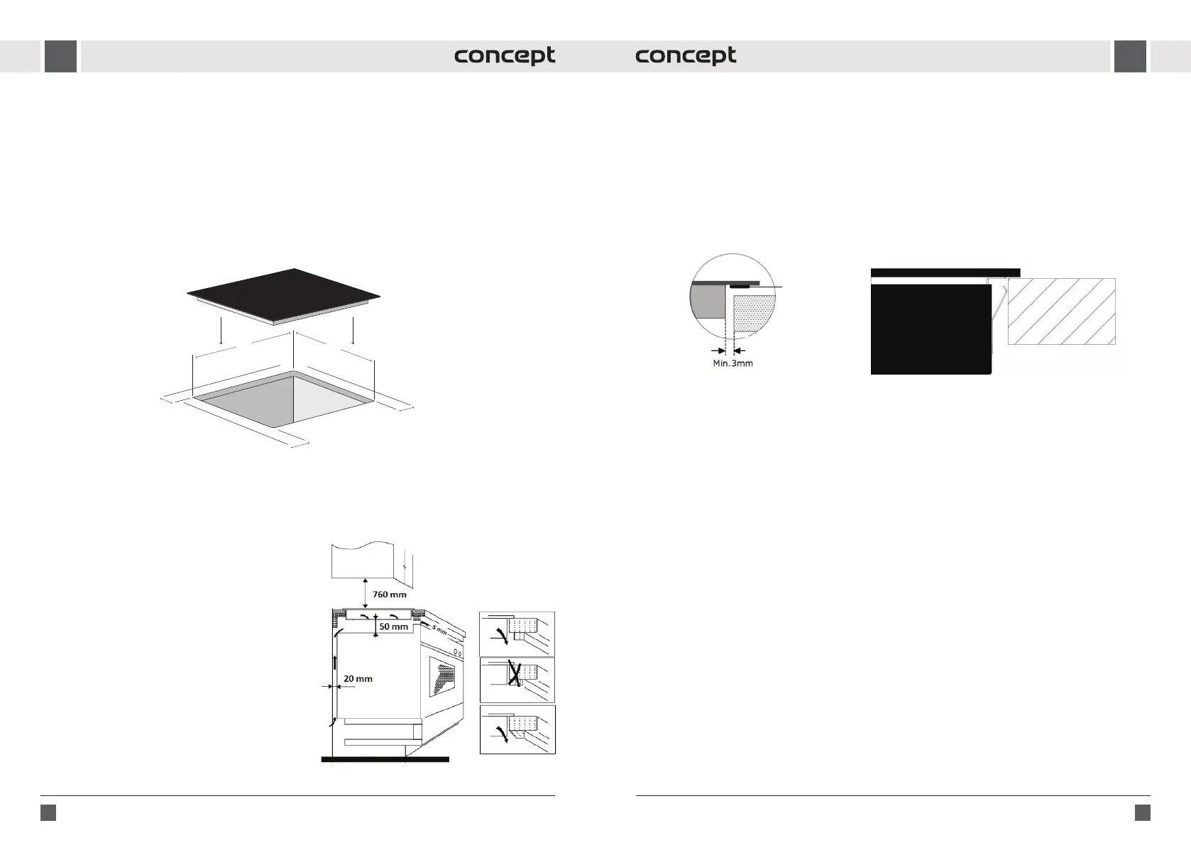 3. Po bokach płyty grzejnej należy pozostawić odstęp co najmniej 50 mm od przedmiotów iszafek wotoczeniu.