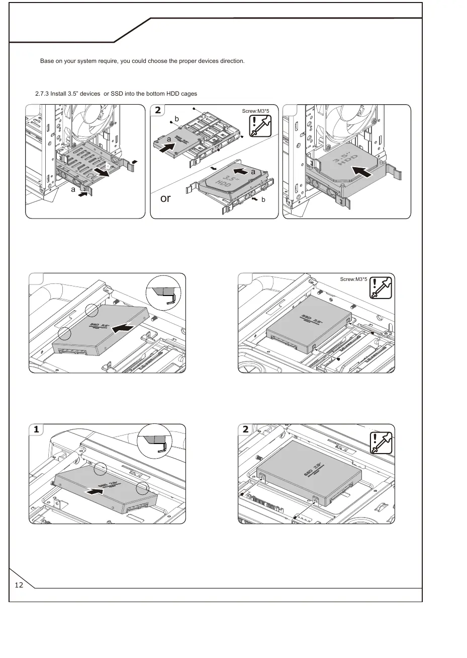 2.7.3 Install 3.5” devices or SSD into the bottom HDD cages