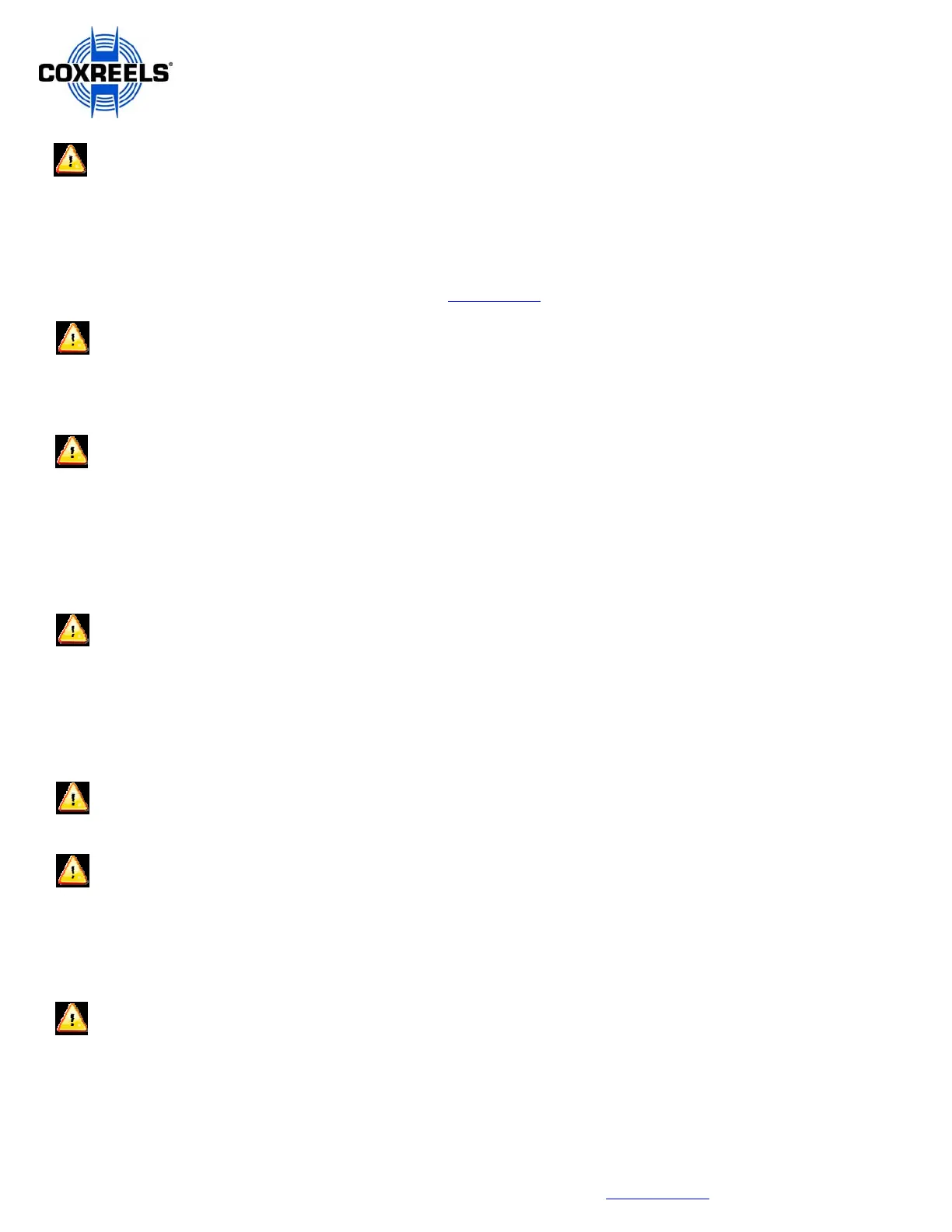 • Modification of the equipment may cause excessive wear and will void the warranty. Contact COXREELS regarding changes or modifications of equipment which