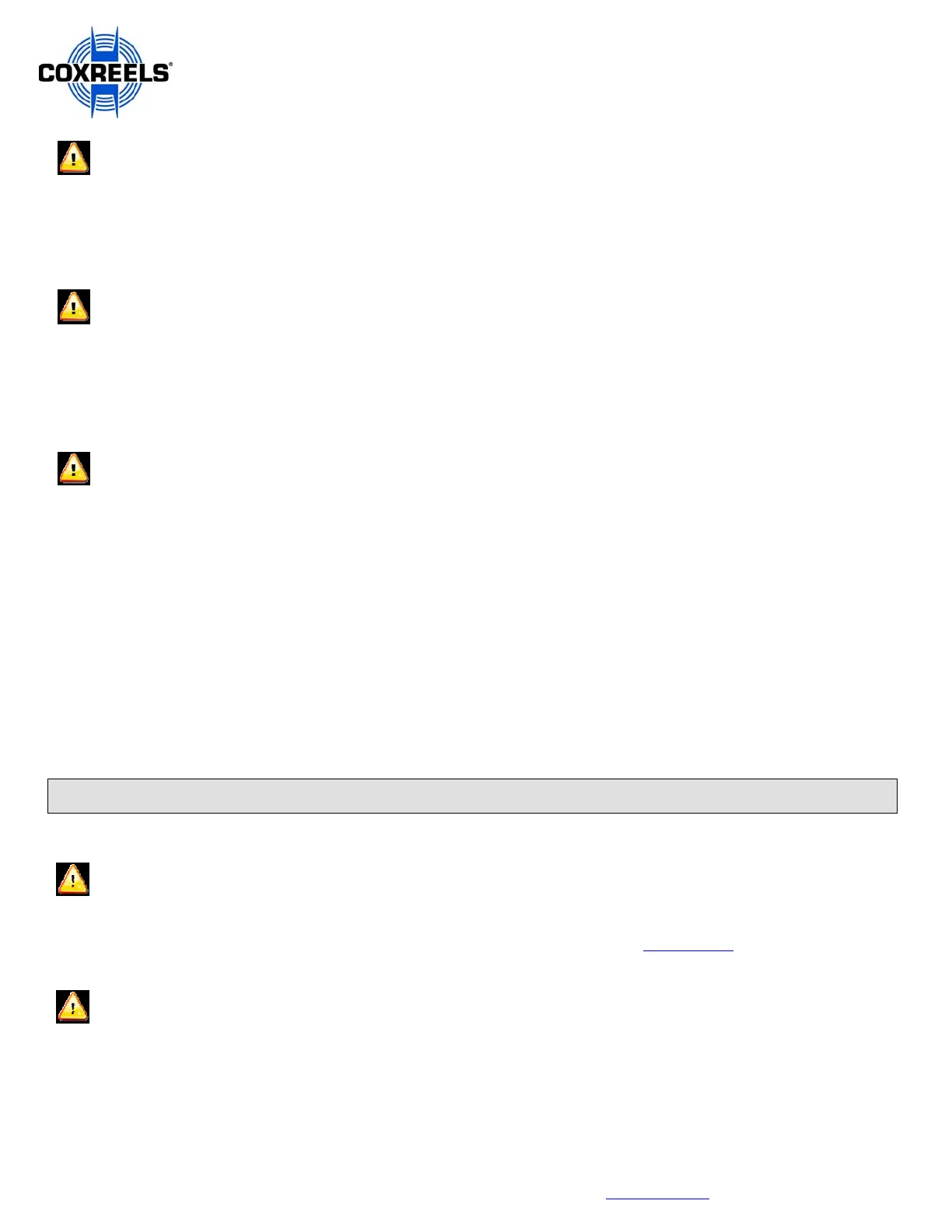 • This hose reel must not be used for pressure greater that the rating listed in the COXREELS catalog / website www.coxreels.com