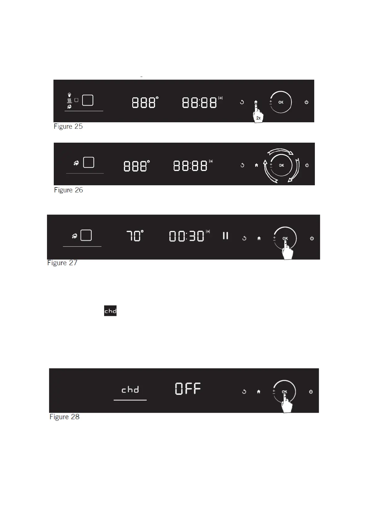 In the settings menu, press the rotary knob while the active setting indicator is on the child lock (“chd”) tab. (see