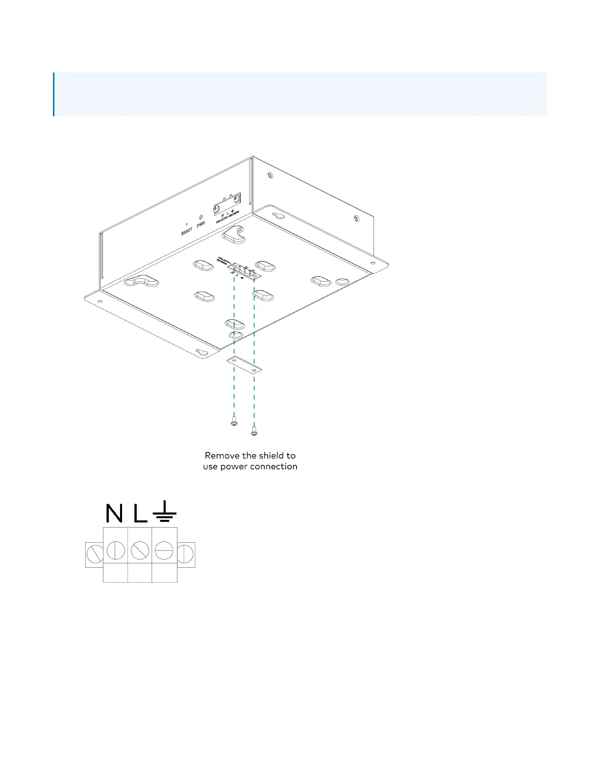 1. Remove the two screws securing the shield to uncover the power connection (the bottom power
