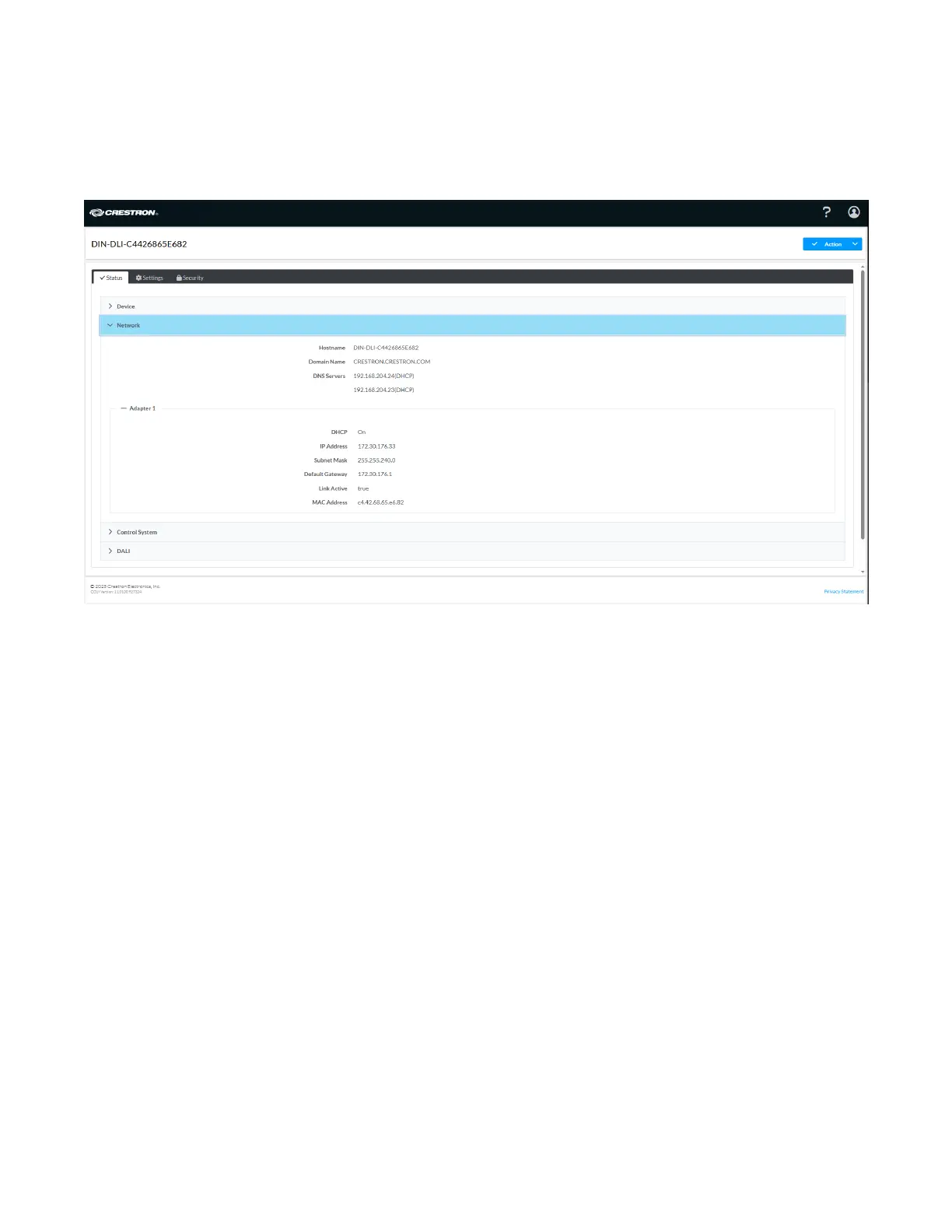 The Control System accordion displays information regarding the connection between the DIN-DLI and