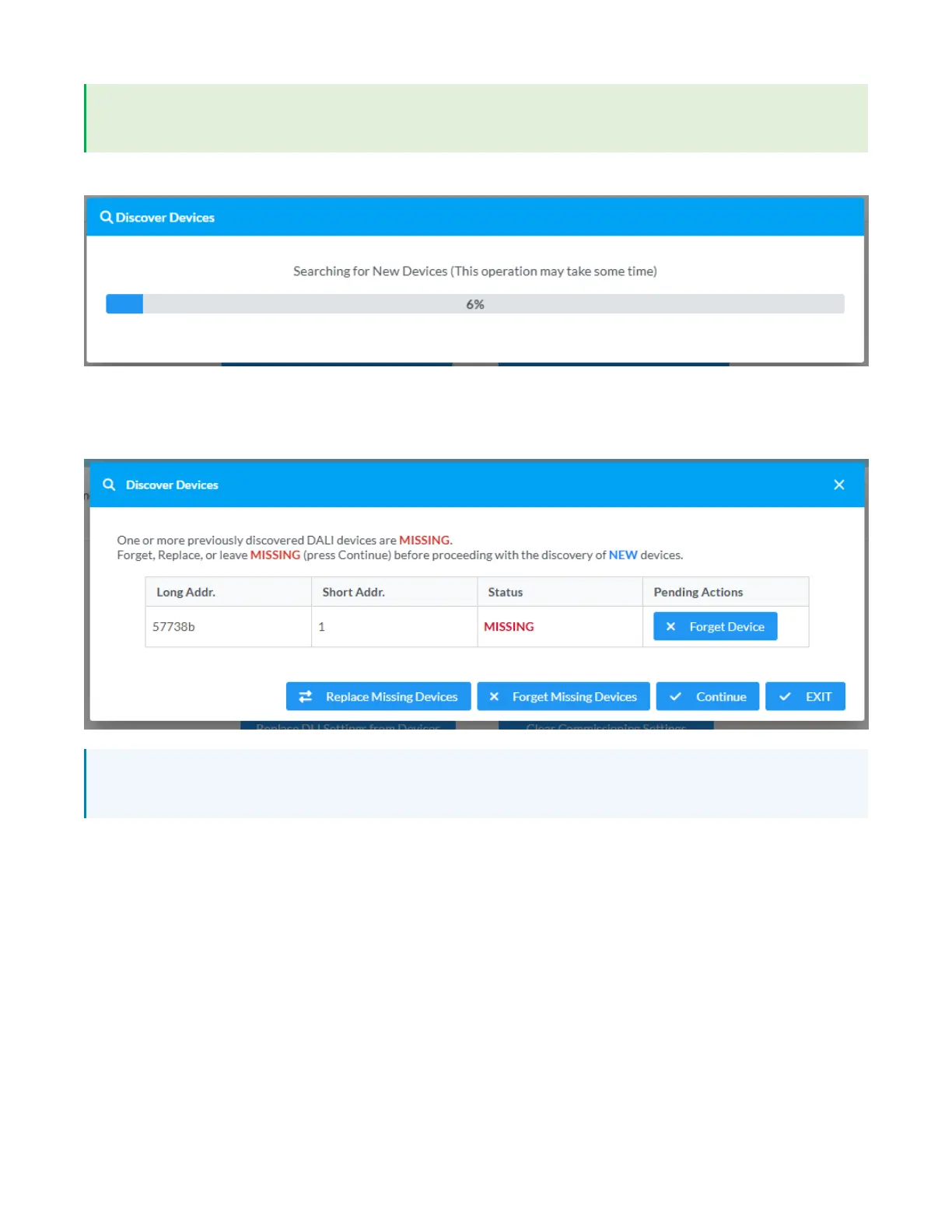 the DALI loop, a Discover Devices table with just those missing devices will appear with options to either