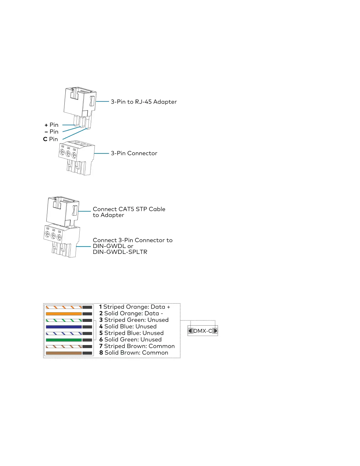 Use the RJ-45 to 3-pin adapter to connect the CAT5 STP cable to the DIN-GWDL and DIN-