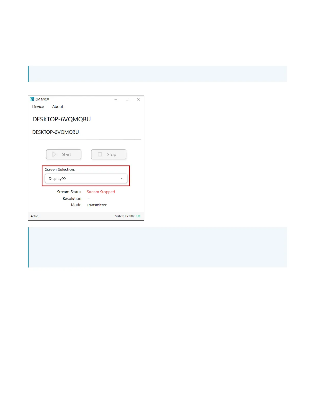 When the DM NVX software is operating in Transmitter mode, Screen Selection enables selection of the