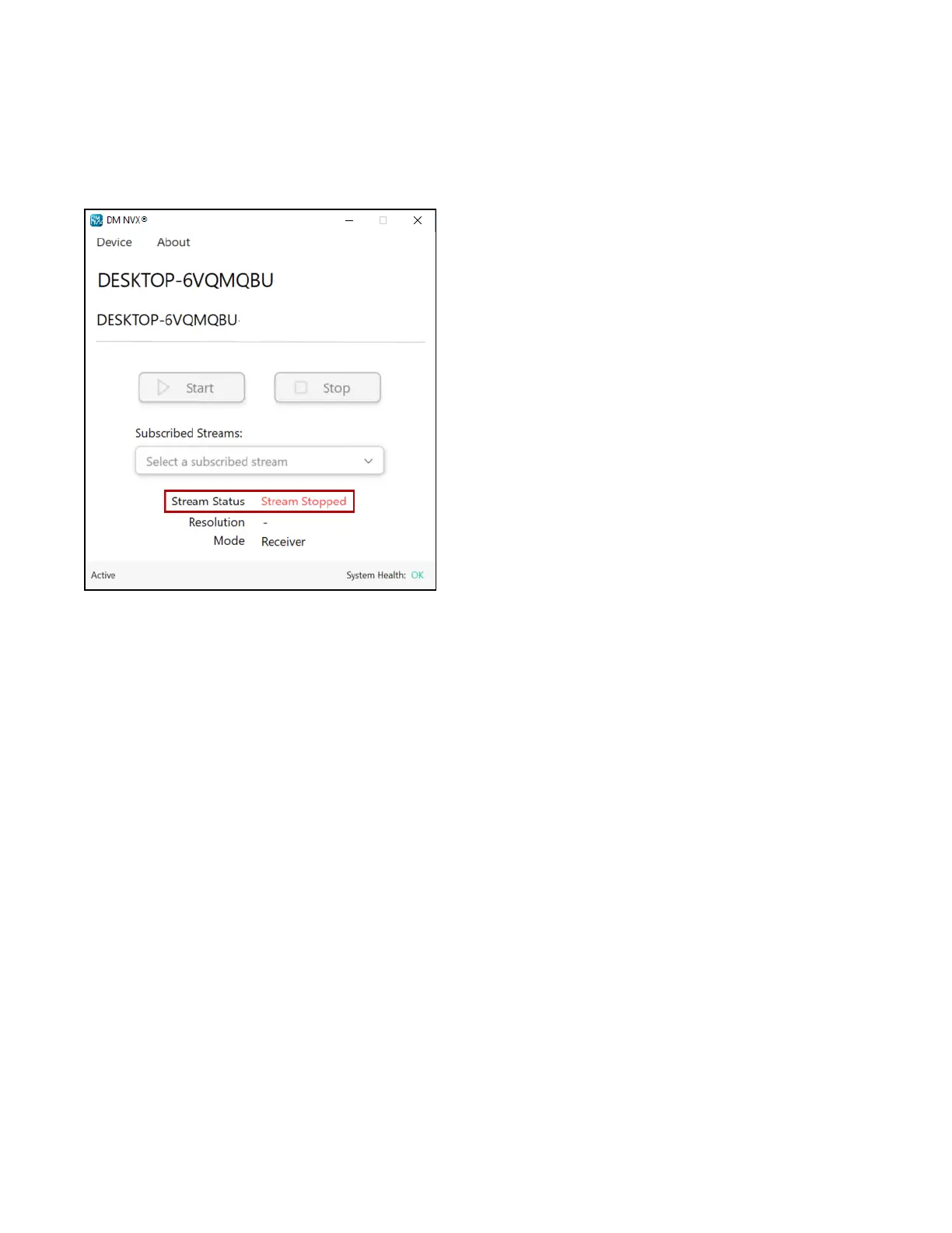 Stream Status displays the status of a stream: Stream Stopped (default setting), Stream Started, or