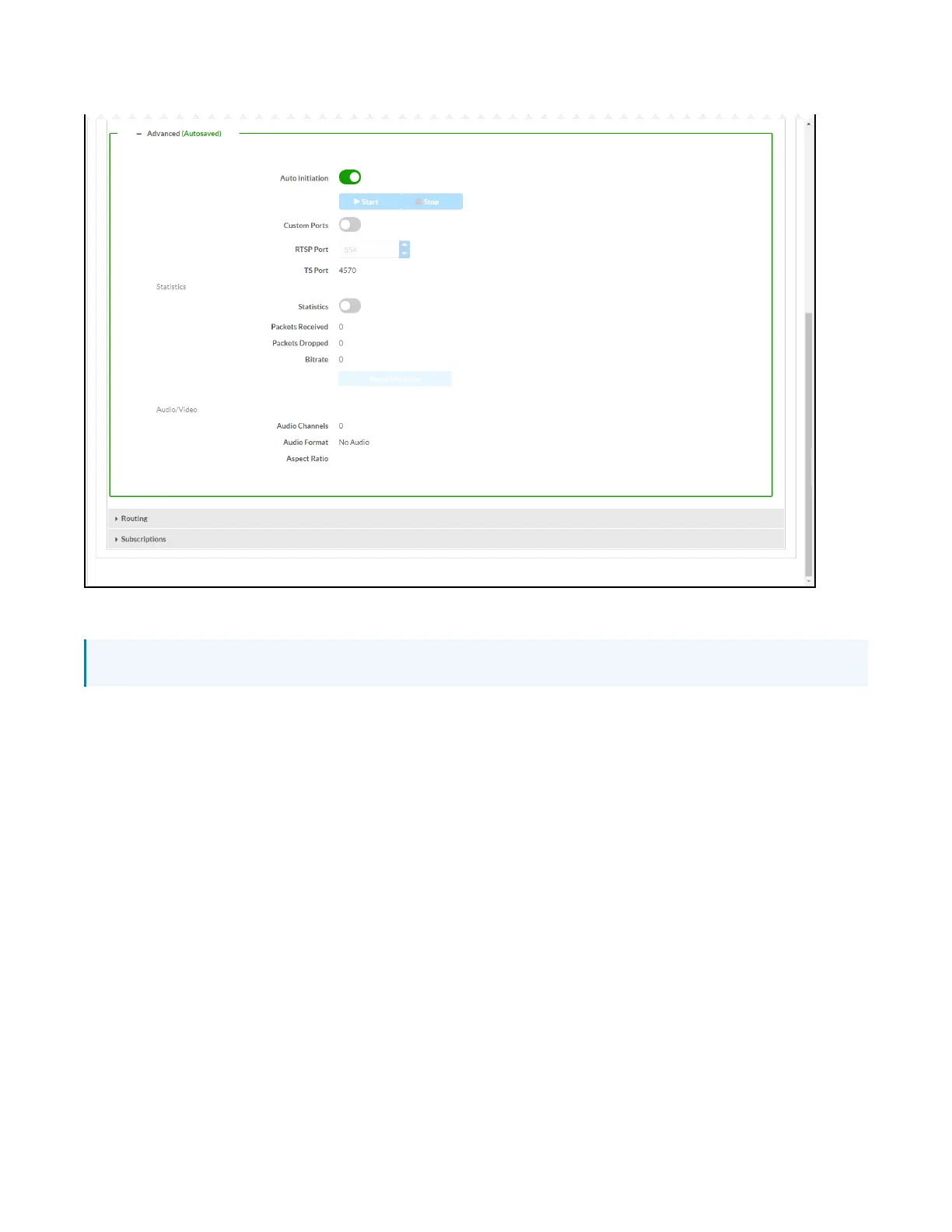 To disable Auto Initiation, set the toggle switch in the Off position. To start the stream, press the