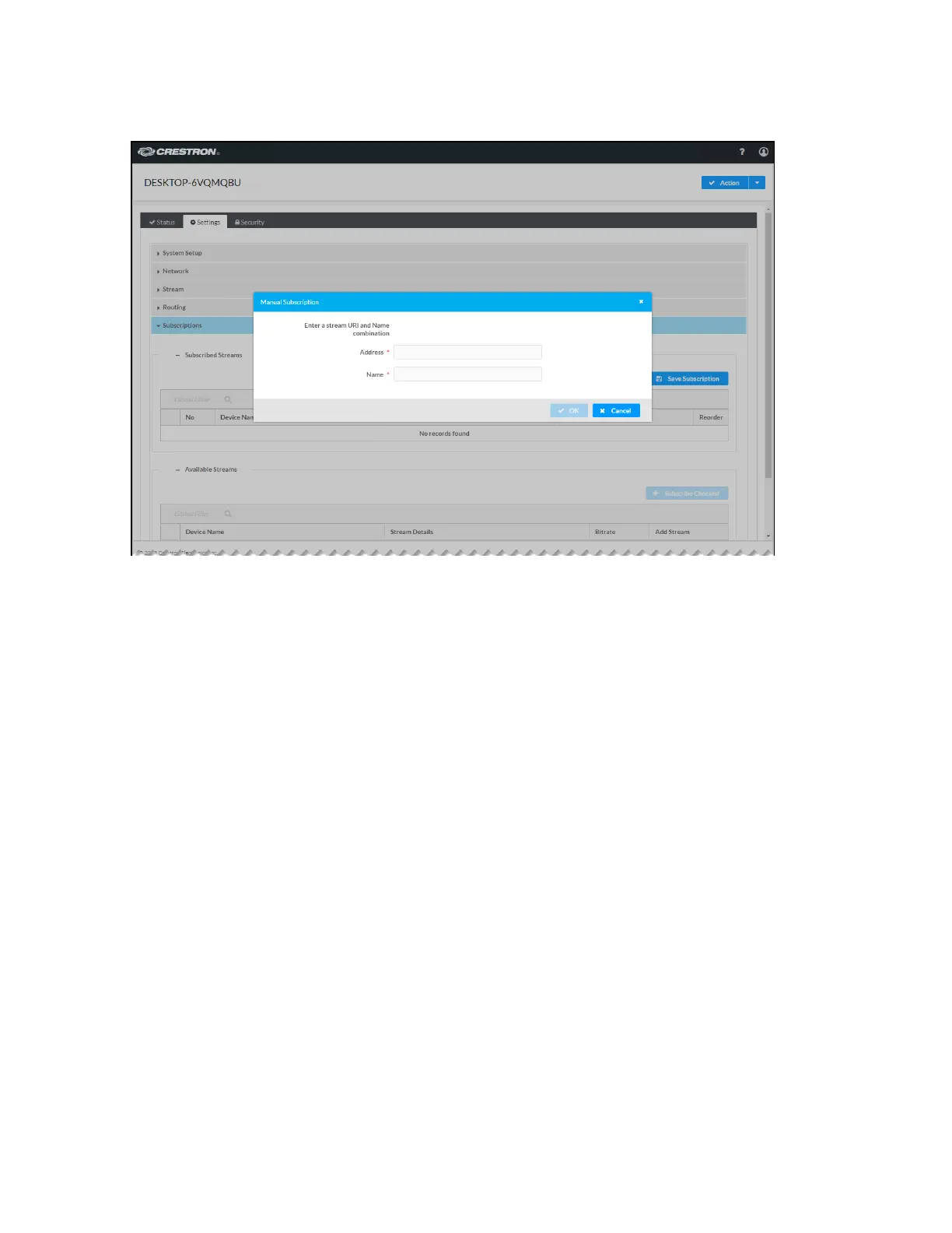 1. Select the Add Stream button. The Manual Subscription pop-up dialog box opens.