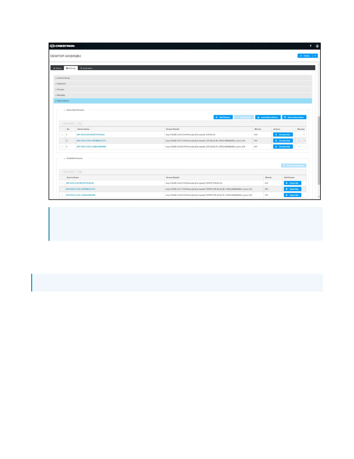 NOTE: Subscribed transmitters can be reordered in the Subscribed Streams table. To do so,