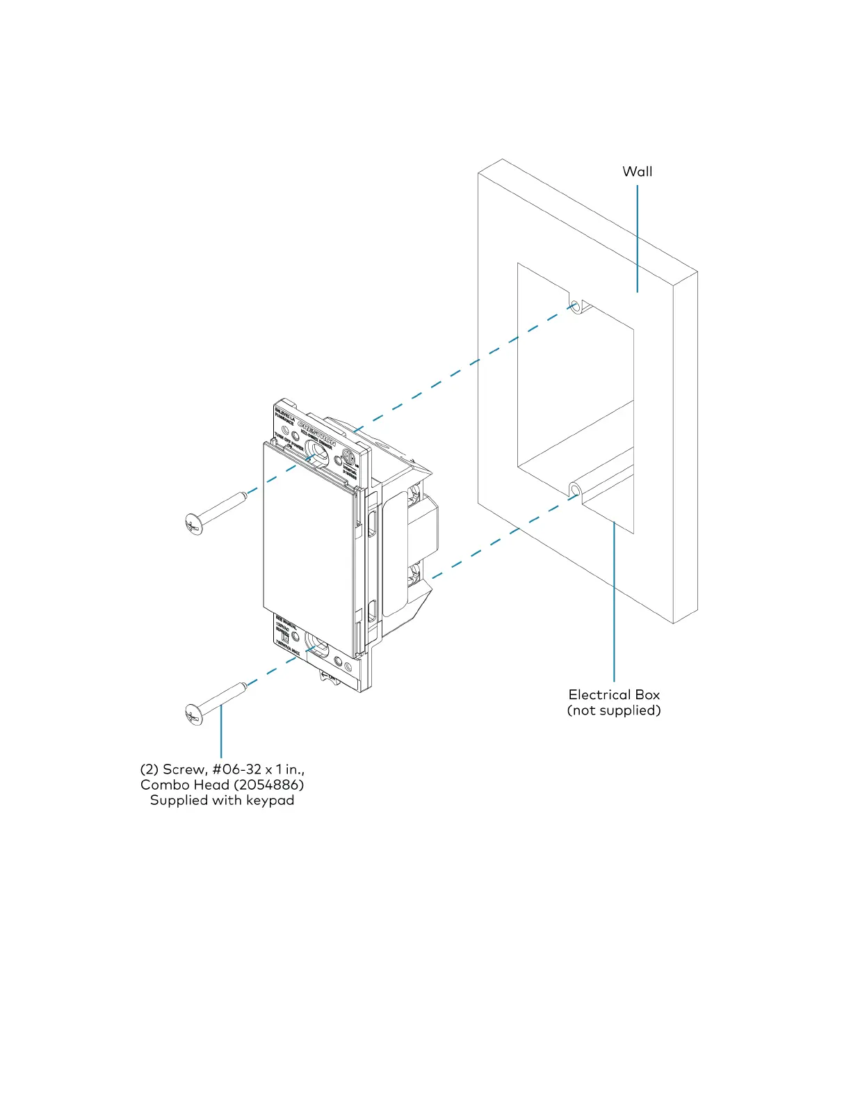 3. Secure the device to the electrical box using two #06-32 x 1in. combo head mounting screws