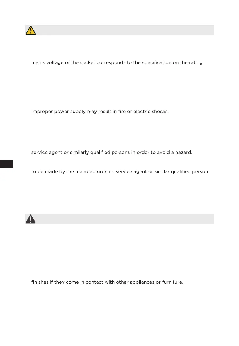 • If the supply cord is damaged, it must be replaced by the manufacturer, its