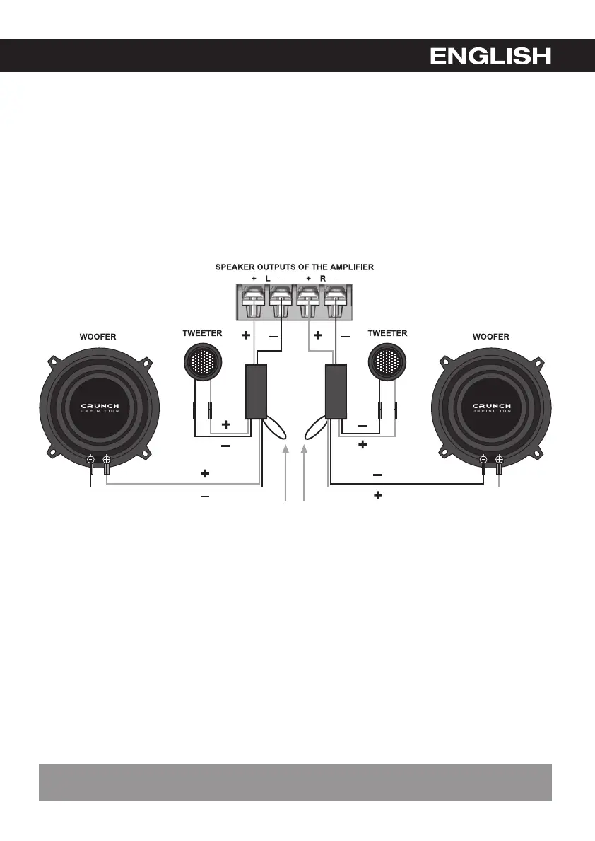 Connect the in-line crossovers to the corresponding speaker outputs of the amplifier.