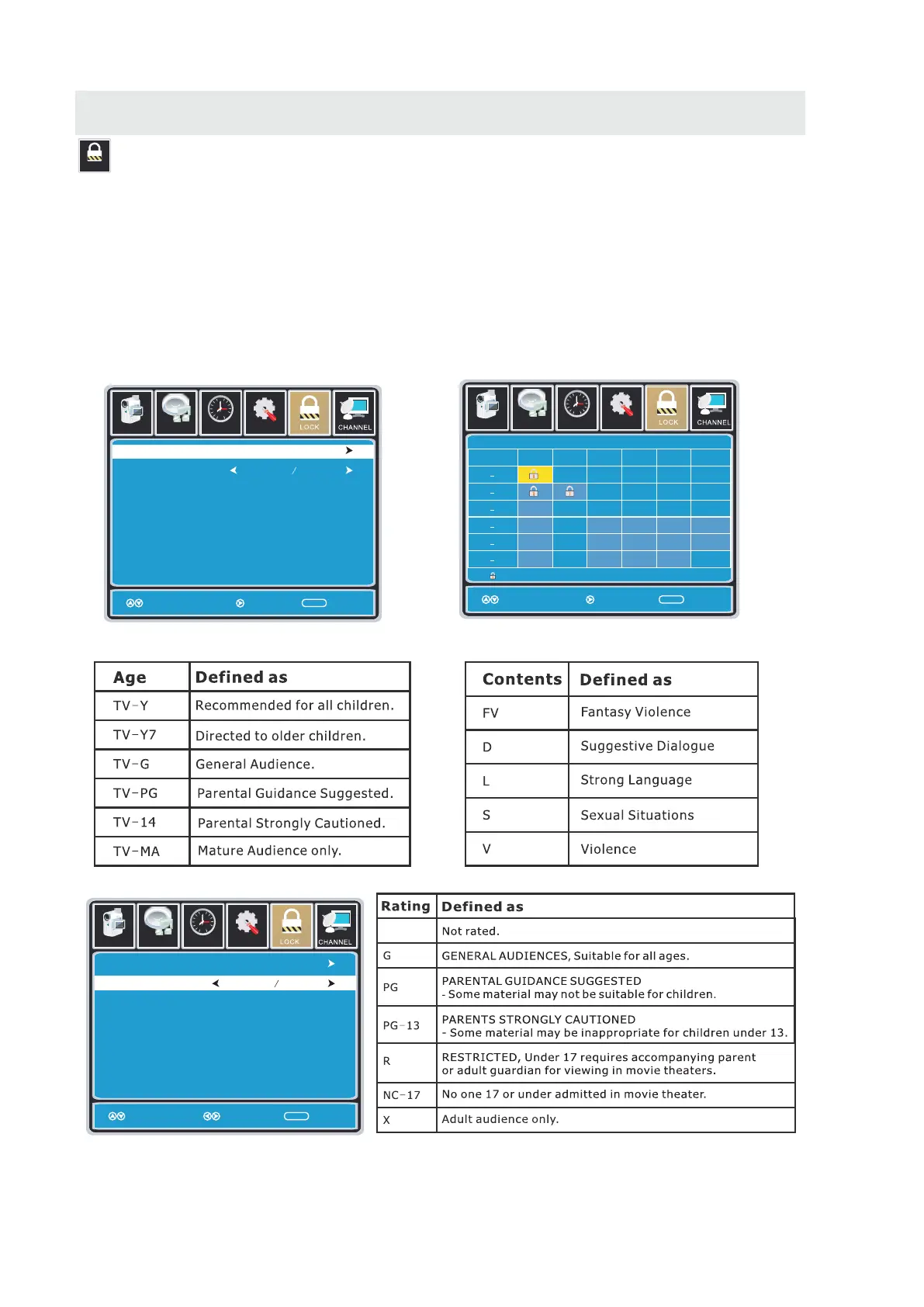 In the LOCK(PARENTAL) menu you may block television and movie programming based on
