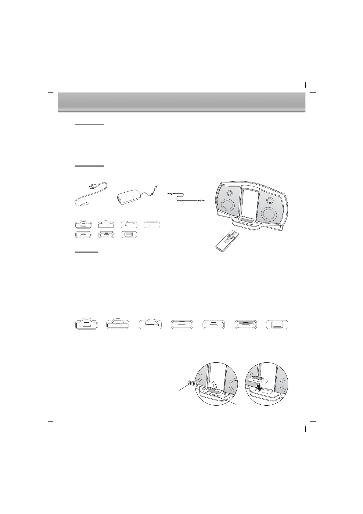 of the system. Each insert is marked so choose one which fits your iPod. To install the insert simply let it