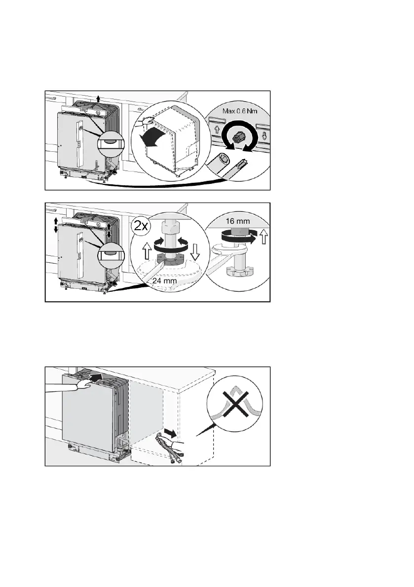 • Pull the inlet and drainage hoses and the supply cord when sliding the dishwasher into place.