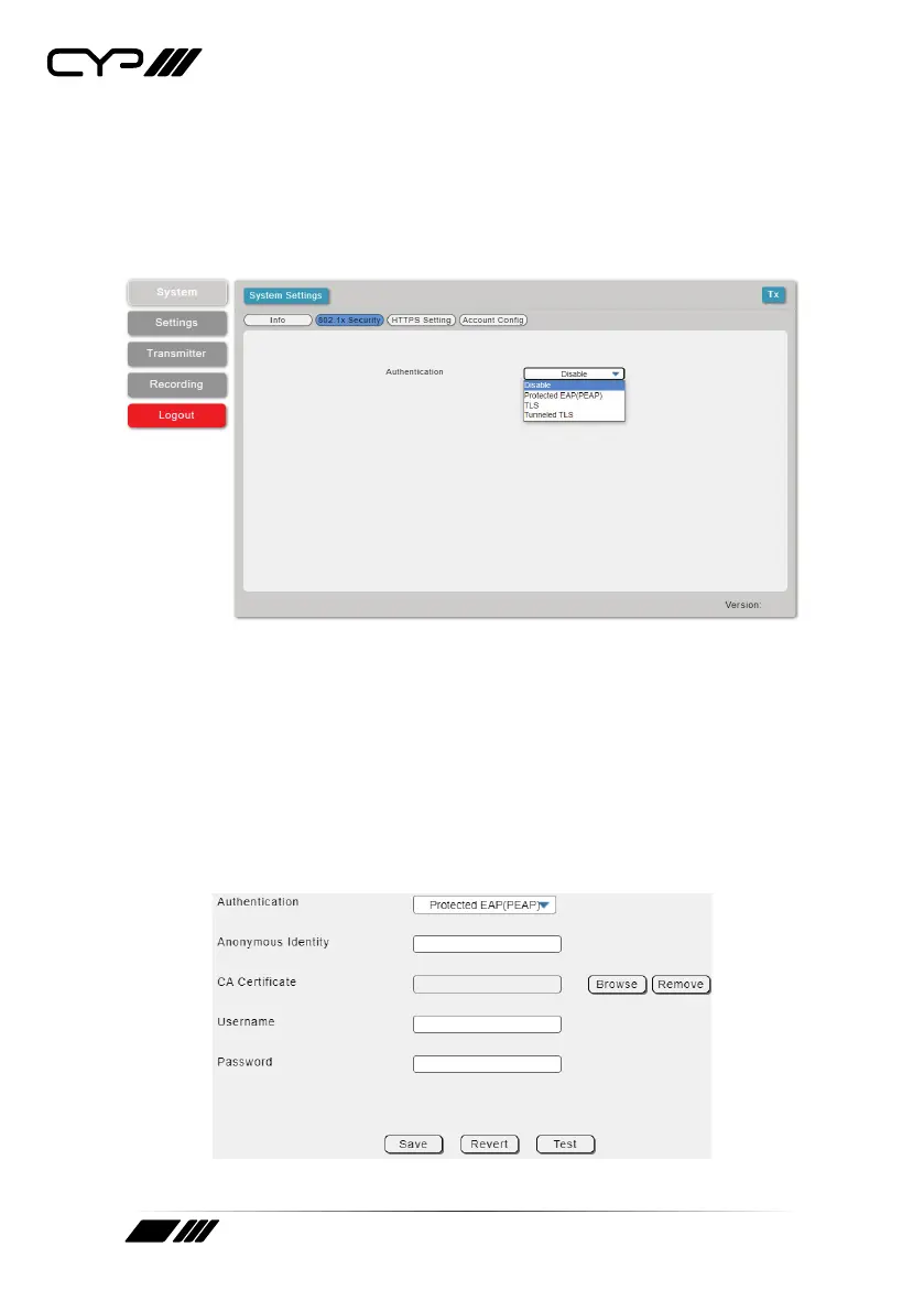 are Disabled, PEAP, TLS, and Tunneled TLS.
