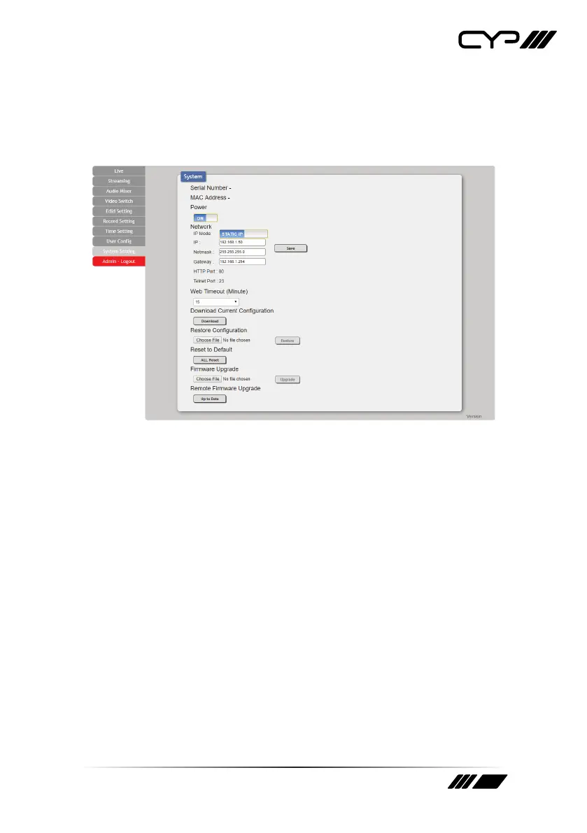 2) Network: IP mode may be switched between Static IP or DHCP.
