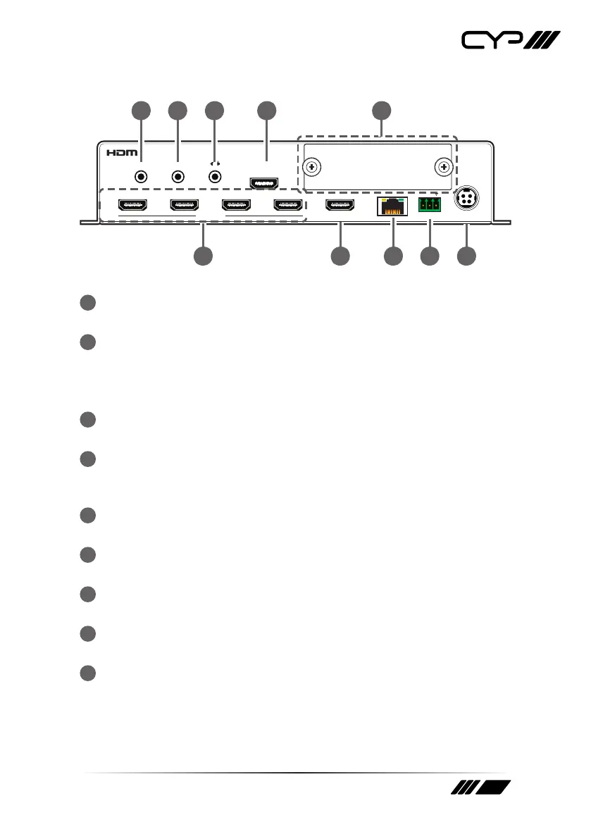 OUT A~B Ports: Connect to HDMI TVs, monitors, or ampliers for