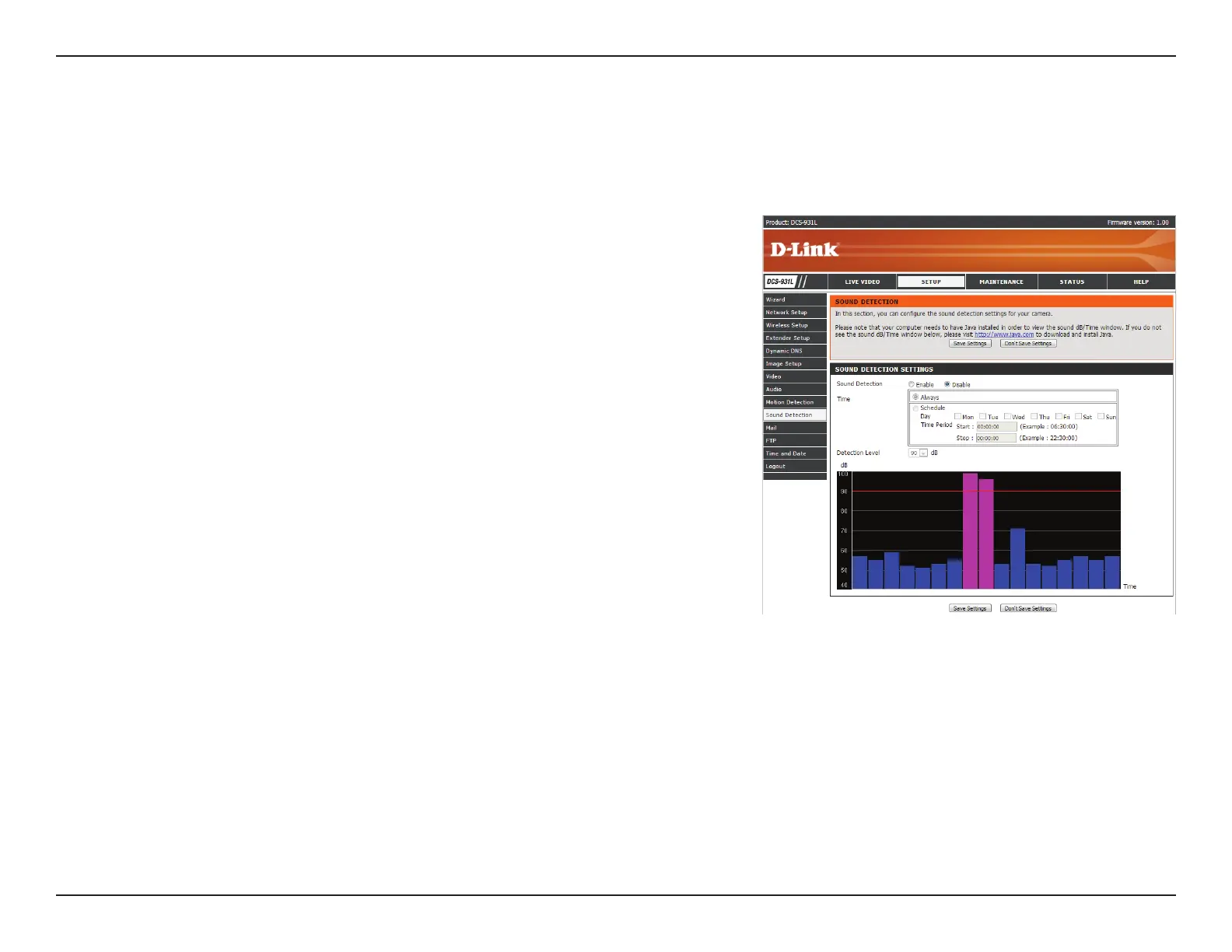 Sound detection allows you to detect when there is a loud sound in the area, which can be used to trigger snapshots or recordings. Refer to “Mail”